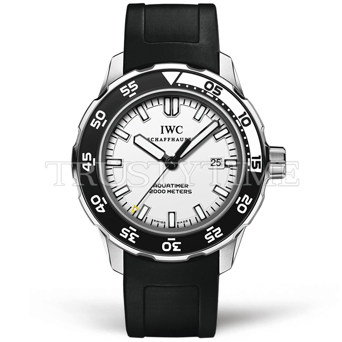 Часы IWC из коллекции Aquatimer. Классические мужские часы IWC Aquatimer Automatic 44mm IW356806 премиального качества (Артикул магазина: IW-0780) оснащены надежным автоматическим механизмом с автоподзаводом (работает от амплитуды движения руки) калибра ETA2892-2, в котором реализованы следующие функции: часовая, минутная и секундная стрелки, а так же дата. Круглый корпус часов стального цвета, имеющий размер 44 мм и высоту 15 мм превосходно дополнит образ и украсит запястье своего обладателя. Для изготовления часов IWC Aquatimer Automatic 44mm IW356806 предлагаемых в нашем интернет-магазине, применяются нержавеющая сталь 316F высокого качества (Швейцарский стандарт), а так же сапфировое стекло высокой прочности, благодаря чему обеспечивается максимальная защита от сколов и механических повреждений. Отличительной чертой данной модели является белый циферблат, часовые индексы которого обеспечивают часовые метки. Завершает образ каучуковый ремешок черного цвета с фирменной классической застежкой IWC. Водонепроницаемость данной модели составляет 30М (WR30) – допускается минимальное воздействие с водой.