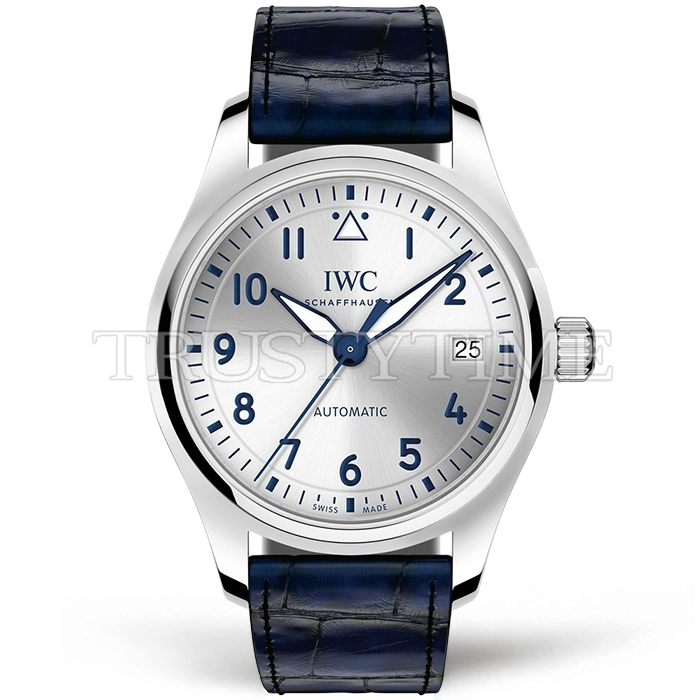 Часы IWC из коллекции Pilot's. Классические женские часы IWC Pilot's Watch Automatic 36mm IW324003 премиального качества (Артикул магазина: IW-0809) оснащены надежным автоматическим механизмом с автоподзаводом (работает от амплитуды движения руки) калибра ETA2892, в котором реализованы следующие функции: часовая, минутная и секундная стрелки, а так же дата. Круглый корпус часов стального цвета, имеющий размер 36 мм и высоту 10.5 мм превосходно дополнит образ и украсит запястье своего обладателя. Для изготовления часов IWC Pilot's Watch Automatic 36mm IW324003 предлагаемых в нашем интернет-магазине, применяются нержавеющая сталь 316L высокого качества (Швейцарский стандарт), а так же сапфировое стекло высокой прочности, благодаря чему обеспечивается максимальная защита от сколов и механических повреждений. Отличительной чертой данной модели является серебристый циферблат, часовые индексы которого обеспечивают арабские цифры. Завершает образ кожаный ремешок синего цвета с фирменной классической застежкой IWC. Водонепроницаемость данной модели составляет 30М (WR30) – допускается минимальное воздействие с водой.