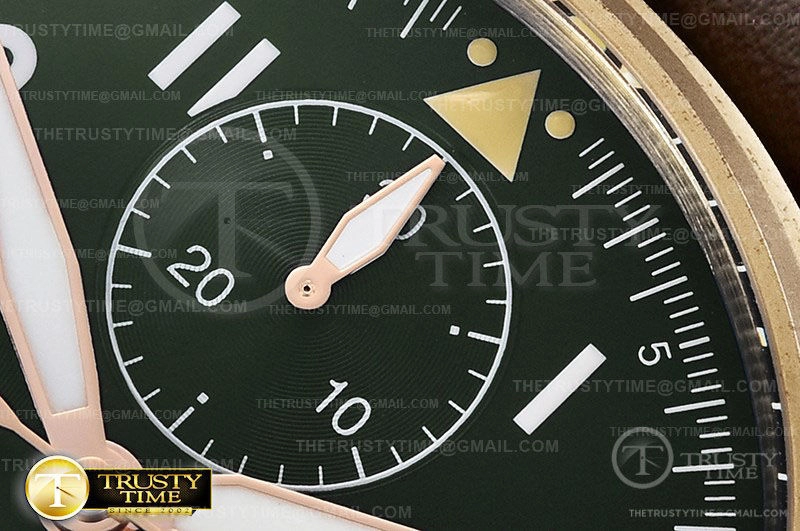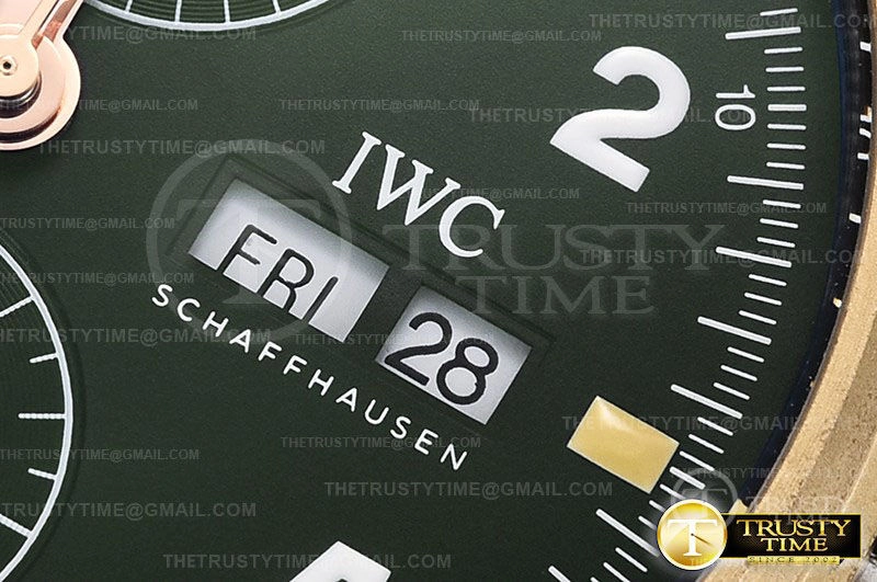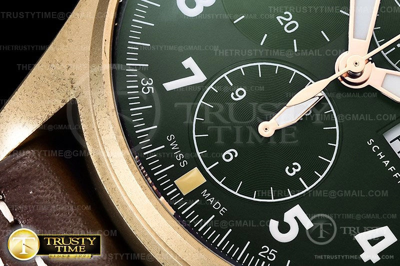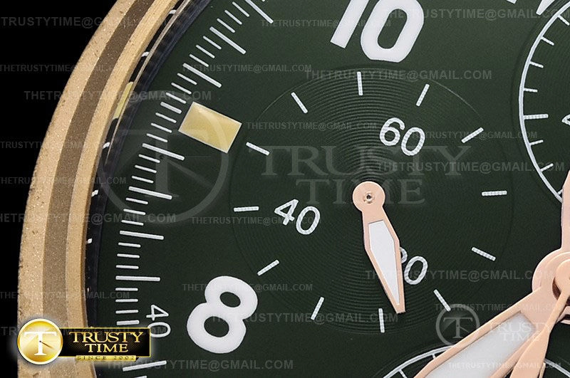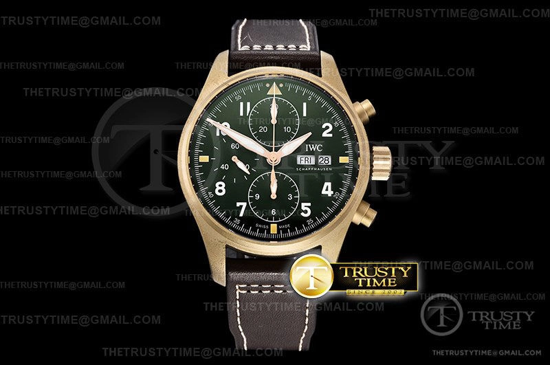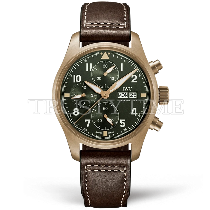 Часы IWC из коллекции Pilot's Chronograph. Спортивные мужские часы IWC Pilot's Watch Chronograph Spitfire IW387902 премиального качества (Артикул магазина: IW-0537) оснащены надежным автоматическим механизмом с автоподзаводом (работает от амплитуды движения руки) калибра Valjoux-7750, в котором реализованы следующие функции: часовая, минутная и секундная стрелки, а так же хронограф, дата, день недели. Круглый корпус часов бронзового цвета, имеющий размер 43 мм и высоту 15 мм превосходно дополнит образ и украсит запястье своего обладателя. Для изготовления часов IWC Pilot's Watch Chronograph Spitfire IW387902 предлагаемых в нашем интернет-магазине, применяются бронза высокого качества (Швейцарский стандарт), а так же сапфировое стекло высокой прочности, благодаря чему обеспечивается максимальная защита от сколов и механических повреждений. Отличительной чертой данной модели является зеленый циферблат, часовые индексы которого обеспечивают арабские цифры. Завершает образ кожаный ремешок коричневого цвета с фирменной классической застежкой IWC. Водонепроницаемость данной модели составляет 30М (WR30) – допускается минимальное воздействие с водой.