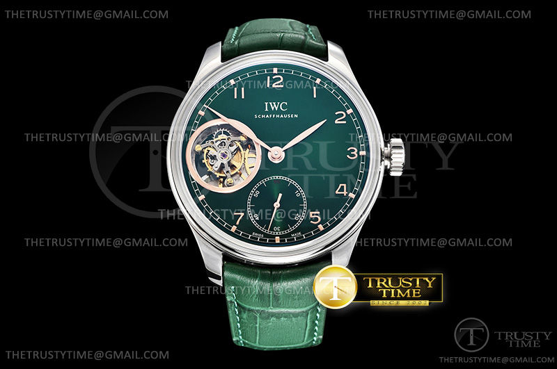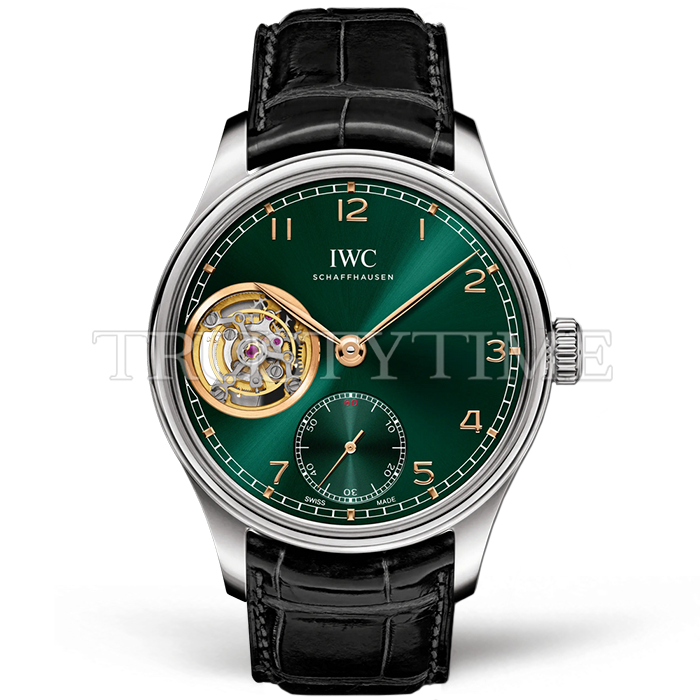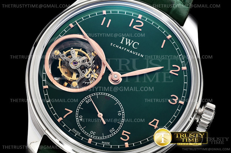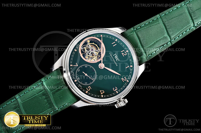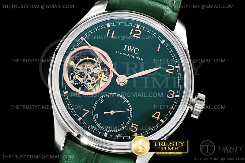 Часы IWC из коллекции Portugieser Tourbillon. Классические мужские часы IWC Portugieser Tourbillon Hand-Wound 43mm IW546307 премиального качества (Артикул магазина: IW-0667) оснащены надежным автоматическим механизмом с ручным заводом калибра Seagull Handwind Tourbillon, в котором реализованы следующие функции: часовая, минутная и секундная стрелки, а так же турбийон. Круглый корпус часов стального цвета, имеющий размер 43 мм и высоту 14 мм превосходно дополнит образ и украсит запястье своего обладателя. Для изготовления часов IWC Portugieser Tourbillon Hand-Wound 43mm IW546307 предлагаемых в нашем интернет-магазине, применяются нержавеющая сталь 316L высокого качества (Швейцарский стандарт), а так же сапфировое стекло высокой прочности, благодаря чему обеспечивается максимальная защита от сколов и механических повреждений. Отличительной чертой данной модели является зеленый циферблат, часовые индексы которого обеспечивают арабские цифры. Завершает образ кожаный ремешок черного цвета с фирменной раскладывающейся застежкой IWC. Водонепроницаемость данной модели составляет 30М (WR30) – допускается минимальное воздействие с водой.