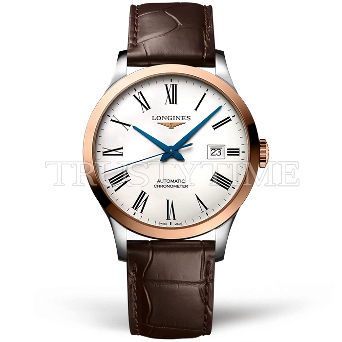 Часы Longines из коллекции Record Collection. Классические мужские часы Longines Tradition Record Collection 40mm L2.821.5.11.2 премиального качества (Артикул магазина: LN-0408) оснащены надежным автоматическим механизмом с автоподзаводом (работает от амплитуды движения руки) калибра L888, в котором реализованы следующие функции: часовая, минутная и секундная стрелки, а так же дата. Круглый корпус часов комбинированного сталь с розового золота цвета, имеющий размер 40 мм и высоту 11.2 мм превосходно дополнит образ и украсит запястье своего обладателя. Для изготовления часов Longines Tradition Record Collection 40mm L2.821.5.11.2 предлагаемых в нашем интернет-магазине, применяются нержавеющая сталь 316F высокого качества (Швейцарский стандарт), а так же сапфировое стекло высокой прочности, благодаря чему обеспечивается максимальная защита от сколов и механических повреждений. Отличительной чертой данной модели является белый циферблат, часовые индексы которого обеспечивают римские цифры. Завершает образ кожаный ремешок коричневого цвета с фирменной раскладывающейся застежкой Longines. Водонепроницаемость данной модели составляет 30М (WR30) – допускается минимальное воздействие с водой.