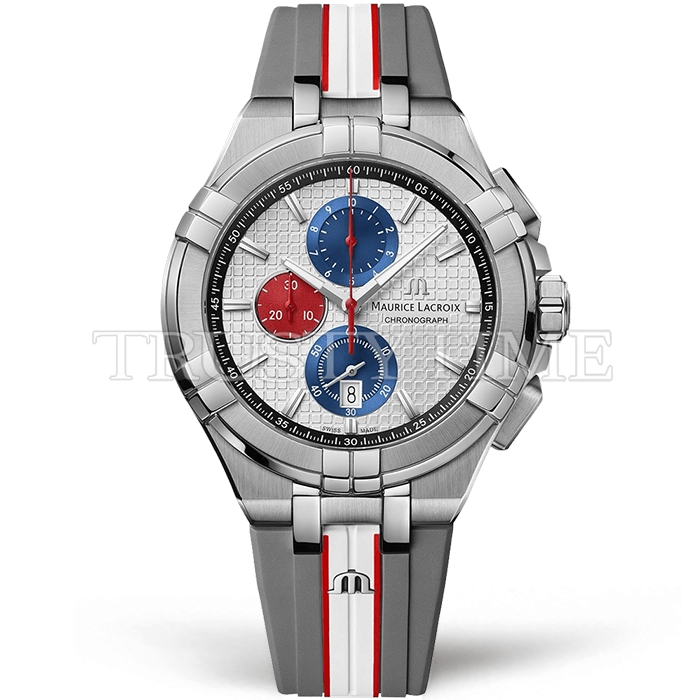 Часы Maurice & Lacroix из коллекции Aikon Quartz. Спортивные мужские часы Maurice Lacroix Aikon Chronograph Quartz Special Edition Mahindra Racing 44 AI1018-TT031-130-2 премиального качества (Артикул магазина: ML-0711) оснащены надежным кварцевым механизмом (работает от батареи) калибра Swiss Quartz ETA, в котором реализованы следующие функции: часовая, минутная и секундная стрелки, а так же хронограф, дата. Круглый корпус часов стального цвета, имеющий размер 44 мм и высоту 11 мм превосходно дополнит образ и украсит запястье своего обладателя. Для изготовления часов Maurice Lacroix Aikon Chronograph Quartz Special Edition Mahindra Racing 44 AI1018-TT031-130-2 предлагаемых в нашем интернет-магазине, применяются нержавеющая сталь 316F высокого качества (Швейцарский стандарт), а так же сапфировое стекло высокой прочности, благодаря чему обеспечивается максимальная защита от сколов и механических повреждений. Отличительной чертой данной модели является серебристый циферблат, часовые индексы которого обеспечивают часовые метки. Завершает образ каучуковый ремешок трех цветов с фирменной раскладывающейся застежкой Maurice & Lacroix. Водонепроницаемость данной модели составляет 30М (WR30) – допускается минимальное воздействие с водой.