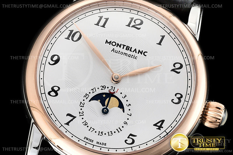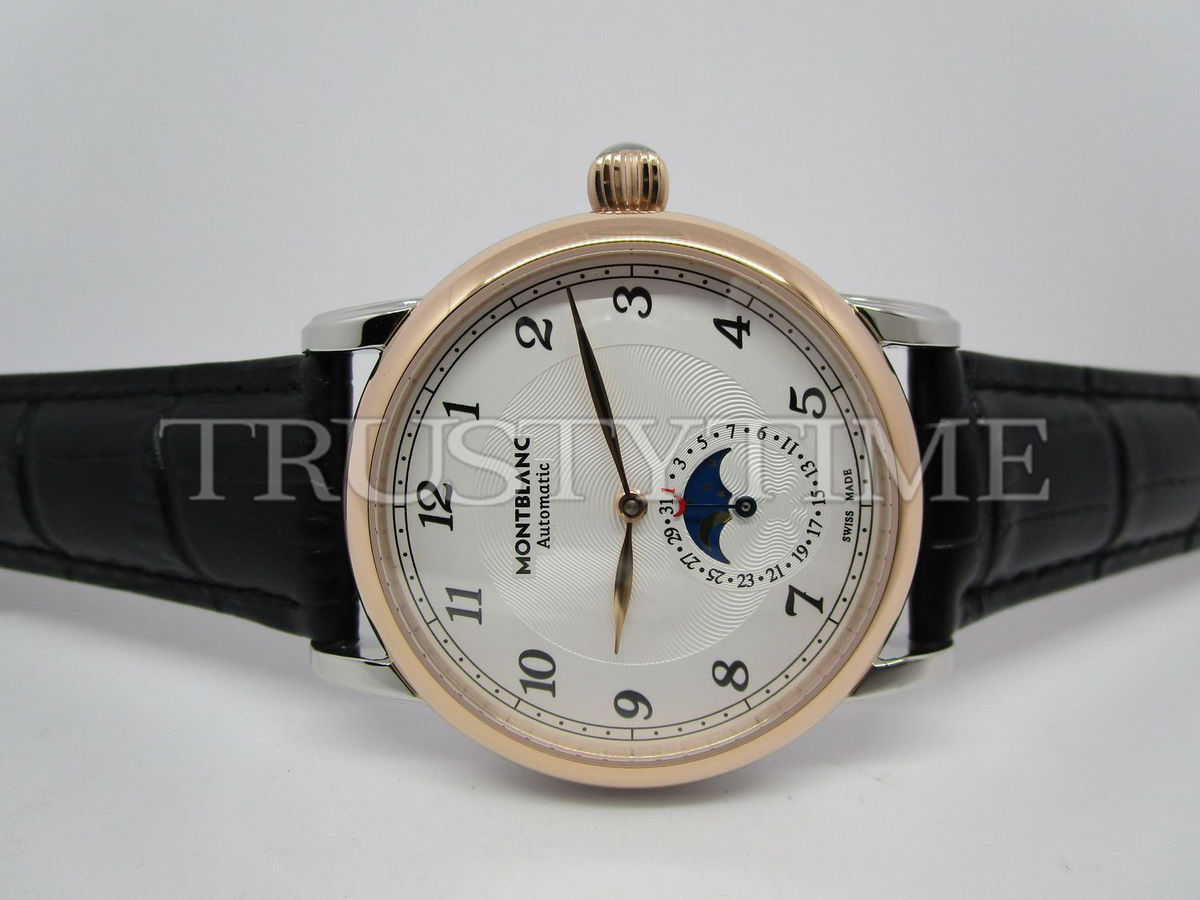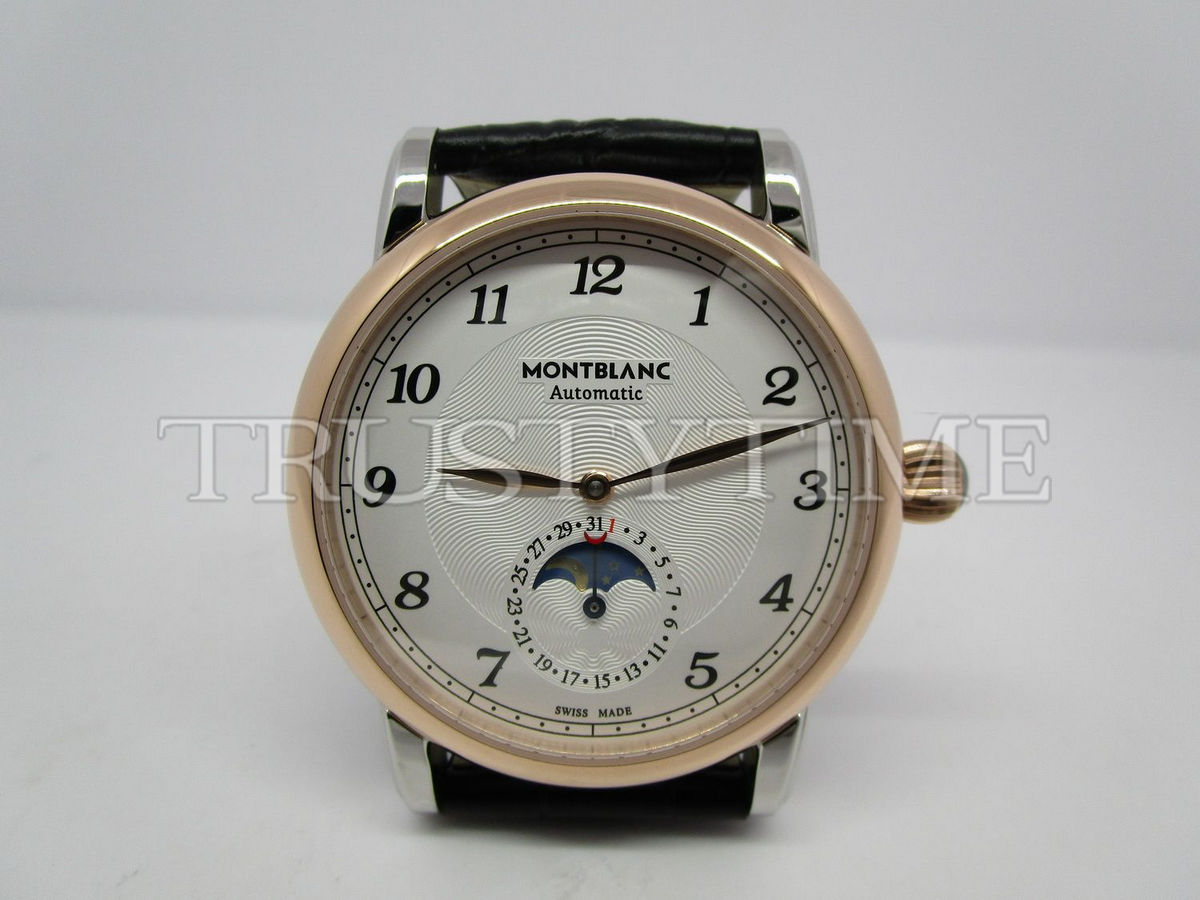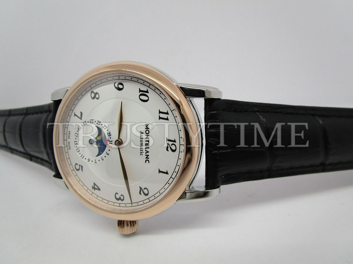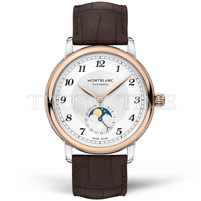 Часы Montblanc из коллекции Star Legacy MoonPhase. Классические мужские часы Montblanc Star Legacy Moonphase 42mm 117580 премиального качества (Артикул магазина: MB-0358) оснащены надежным автоматическим механизмом с автоподзаводом (работает от амплитуды движения руки) калибра MY9015, в котором реализованы следующие функции: часова и минутка стрелки, а так же дата, фаза луны. Круглый корпус часов комбинированного сталь с розового золота цвета, имеющий размер 42 мм и высоту 12.5 мм превосходно дополнит образ и украсит запястье своего обладателя. Для изготовления часов Montblanc Star Legacy Moonphase 42mm 117580 предлагаемых в нашем интернет-магазине, применяются нержавеющая сталь 316L высокого качества (Швейцарский стандарт), а так же сапфировое стекло высокой прочности, благодаря чему обеспечивается максимальная защита от сколов и механических повреждений. Отличительной чертой данной модели является белый циферблат, часовые индексы которого обеспечивают арабские цифры. Завершает образ кожаный ремешок коричневого цвета с фирменной раскладывающейся застежкой Montblanc. Водонепроницаемость данной модели составляет 30М (WR30) – допускается минимальное воздействие с водой.