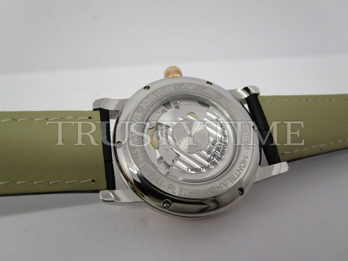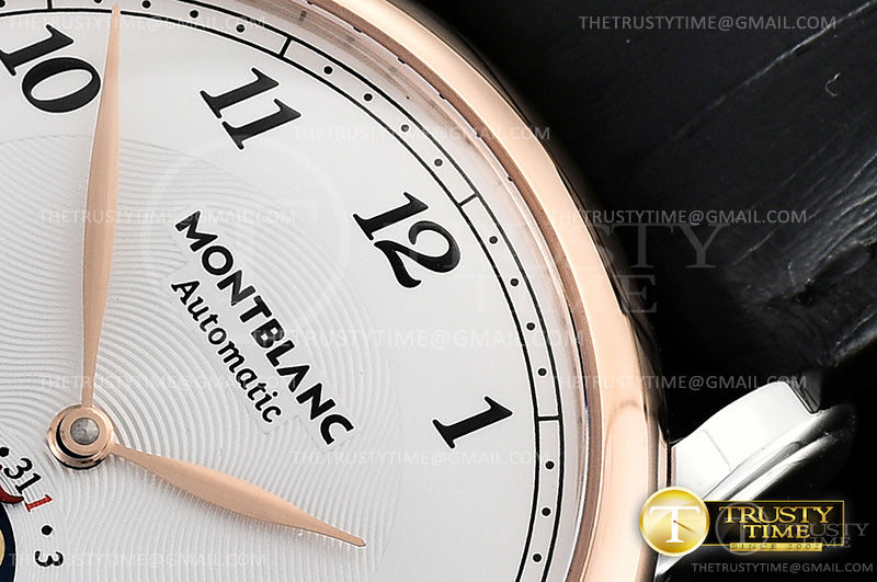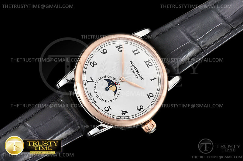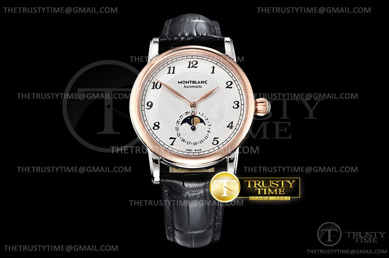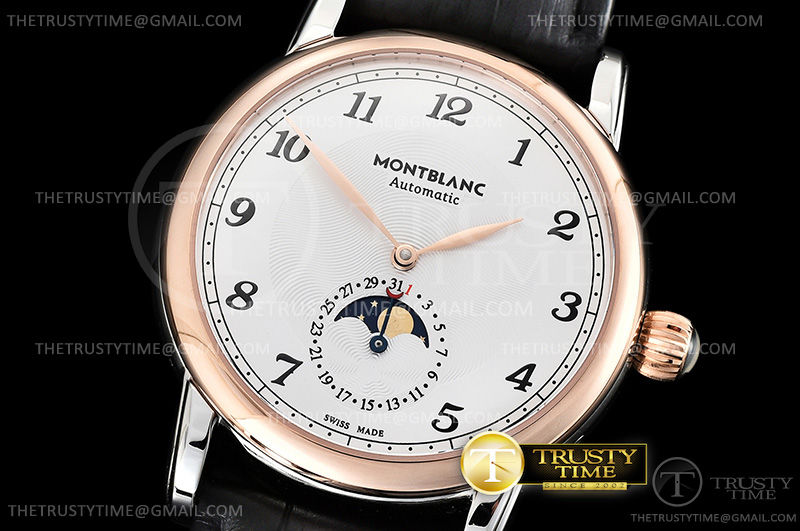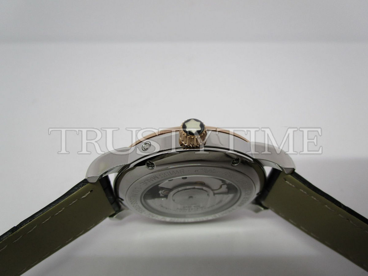 Часы Montblanc из коллекции Star Legacy MoonPhase. Классические мужские часы Montblanc Star Legacy Moonphase 42mm 117580 премиального качества (Артикул магазина: MB-0358) оснащены надежным автоматическим механизмом с автоподзаводом (работает от амплитуды движения руки) калибра MY9015, в котором реализованы следующие функции: часова и минутка стрелки, а так же дата, фаза луны. Круглый корпус часов комбинированного сталь с розового золота цвета, имеющий размер 42 мм и высоту 12.5 мм превосходно дополнит образ и украсит запястье своего обладателя. Для изготовления часов Montblanc Star Legacy Moonphase 42mm 117580 предлагаемых в нашем интернет-магазине, применяются нержавеющая сталь 316L высокого качества (Швейцарский стандарт), а так же сапфировое стекло высокой прочности, благодаря чему обеспечивается максимальная защита от сколов и механических повреждений. Отличительной чертой данной модели является белый циферблат, часовые индексы которого обеспечивают арабские цифры. Завершает образ кожаный ремешок коричневого цвета с фирменной раскладывающейся застежкой Montblanc. Водонепроницаемость данной модели составляет 30М (WR30) – допускается минимальное воздействие с водой.