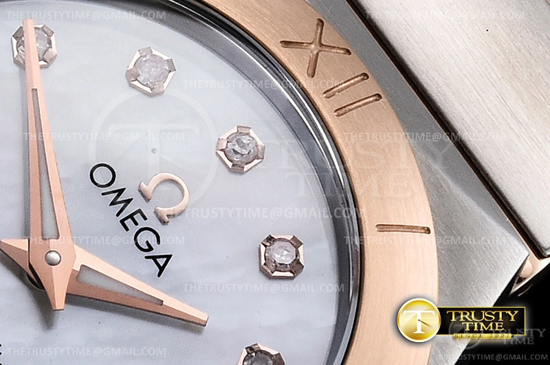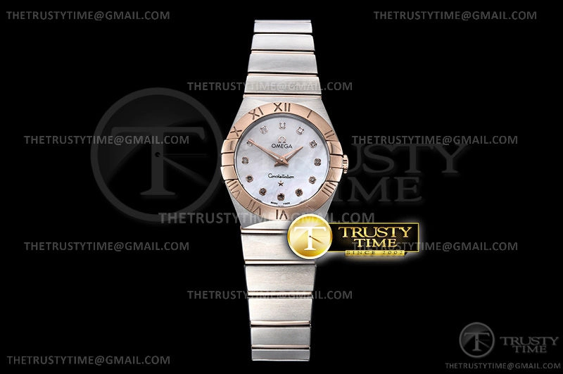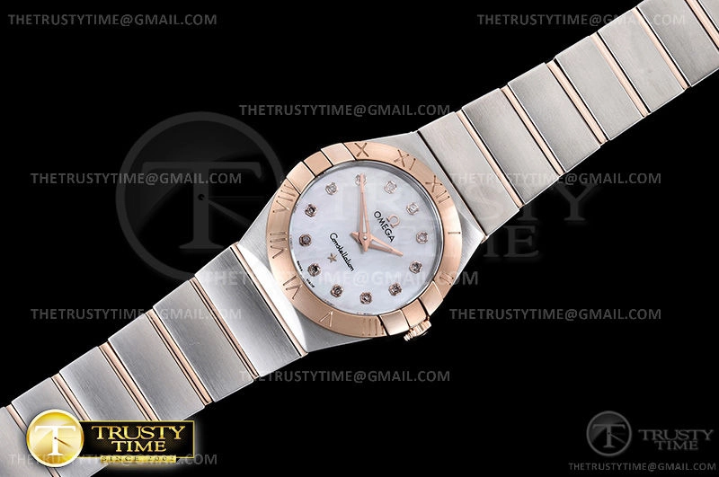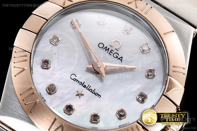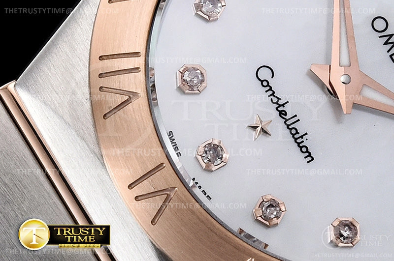 Часы Omega из коллекции Constellation. Классические женские часы Omega Constellation Quartz 28mm 131.20.28.60.55.001 премиального качества (Артикул магазина: OM-0457) оснащены надежным кварцевым механизмом (работает от батареи) калибра Swiss Quartz ETA, в котором реализованы следующие функции: часова и минутка стрелки, а так же максимально простой функционал без усложнений. Круглый корпус часов комбинированного сталь с розового золота цвета, имеющий размер 28 мм и высоту 9 мм превосходно дополнит образ и украсит запястье своего обладателя. Для изготовления часов Omega Constellation Quartz 28mm 131.20.28.60.55.001 предлагаемых в нашем интернет-магазине, применяются нержавеющая сталь 316F высокого качества (Швейцарский стандарт), а так же сапфировое стекло высокой прочности, благодаря чему обеспечивается максимальная защита от сколов и механических повреждений. Отличительной чертой данной модели является перламутровый циферблат, часовые индексы которого обеспечивают камни. Завершает образ браслет из нержавеющей стали комбинированного сталь с розовым золотом цвета с фирменной раскладывающейся застежкой Omega. Водонепроницаемость данной модели составляет 30М (WR30) – допускается минимальное воздействие с водой.