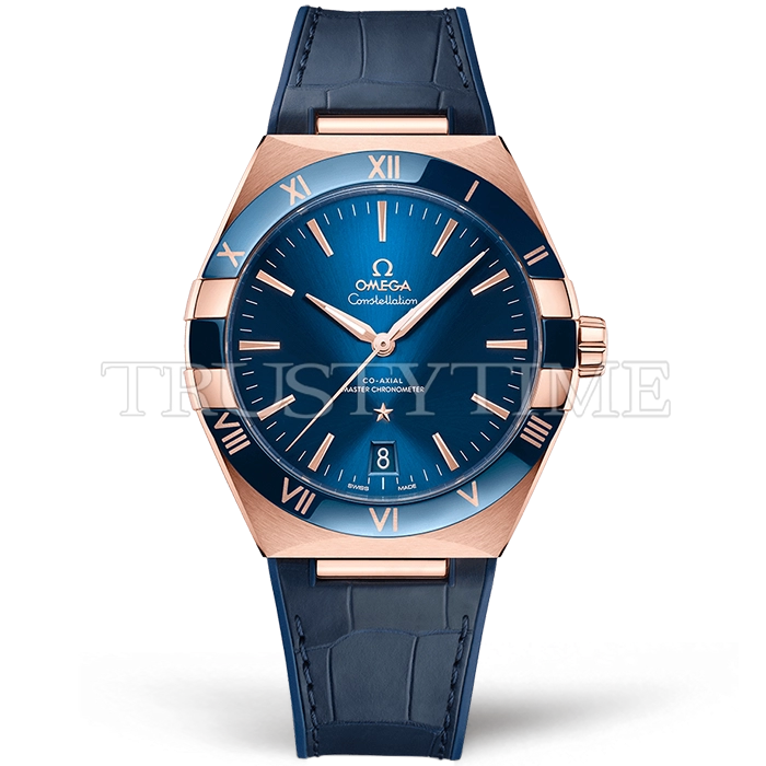 Часы Omega из коллекции Constellation. Классические мужские часы Omega Constellation Co-Axial Master Chronometer 41mm 131.63.41.21.03.001 премиального качества (Артикул магазина: OM-0859) оснащены надежным автоматическим механизмом с автоподзаводом (работает от амплитуды движения руки) калибра 8901, в котором реализованы следующие функции: часовая, минутная и секундная стрелки, а так же дата. Круглый корпус часов розового цвета, имеющий размер 41 мм и высоту 13 мм превосходно дополнит образ и украсит запястье своего обладателя. Для изготовления часов Omega Constellation Co-Axial Master Chronometer 41mm 131.63.41.21.03.001 предлагаемых в нашем интернет-магазине, применяются нержавеющая сталь 316F высокого качества (Швейцарский стандарт), а так же сапфировое стекло высокой прочности, благодаря чему обеспечивается максимальная защита от сколов и механических повреждений. Отличительной чертой данной модели является синий циферблат, часовые индексы которого обеспечивают часовые метки. Завершает образ кожаный ремешок синего цвета с фирменной раскладывающейся застежкой Omega. Водонепроницаемость данной модели составляет 30М (WR30) – допускается минимальное воздействие с водой.