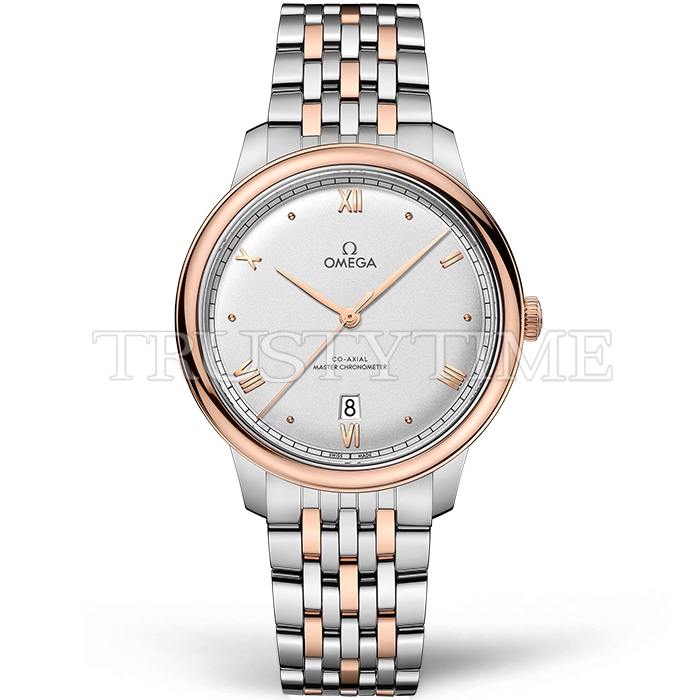 Часы Omega из коллекции De Ville Prestige. Классические мужские часы Omega De Ville Prestige Co‑Axial Master Chronometer 40mm 434.20.40.20.02 премиального качества (Артикул магазина: OM-1012) оснащены надежным автоматическим механизмом с автоподзаводом (работает от амплитуды движения руки) калибра 8800, в котором реализованы следующие функции: часовая, минутная и секундная стрелки, а так же дата. Круглый корпус часов комбинированного сталь с розового золота цвета, имеющий размер 40 мм и высоту 11 мм превосходно дополнит образ и украсит запястье своего обладателя. Для изготовления часов Omega De Ville Prestige Co‑Axial Master Chronometer 40mm 434.20.40.20.02 предлагаемых в нашем интернет-магазине, применяются нержавеющая сталь 316F высокого качества (Швейцарский стандарт), а так же сапфировое стекло высокой прочности, благодаря чему обеспечивается максимальная защита от сколов и механических повреждений. Отличительной чертой данной модели является серебристый циферблат, часовые индексы которого обеспечивают римские цифры, часовые индексы которого обеспечивают часовые метки. Завершает образ браслет из нержавеющей стали комбинированного сталь с розовым золотом цвета с фирменной раскладывающейся застежкой Omega. Водонепроницаемость данной модели составляет 30М (WR30) – допускается минимальное воздействие с водой.