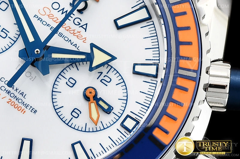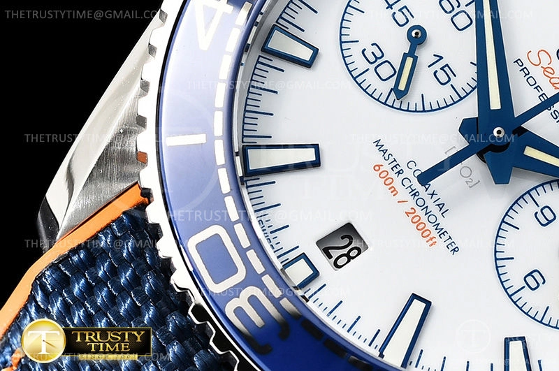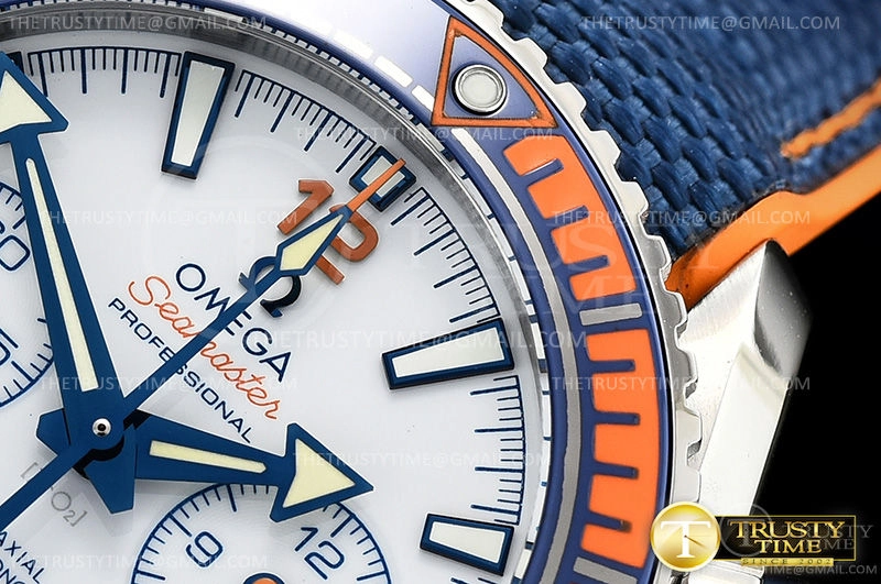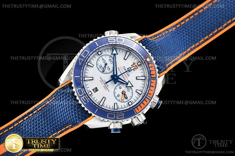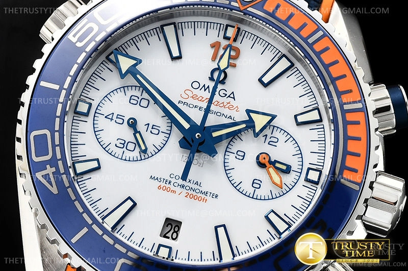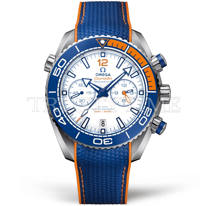 Часы Omega из коллекции Seamaster Planet Ocean Chronograph. Спортивные мужские часы Omega Seamaster Planet Ocean 600m Co‑Axial Master Chronometer Chronograph "MICHAEL PHELPS" 45.5mm 215.32.46.51.04.001 премиального качества (Артикул магазина: OM-0592) оснащены надежным автоматическим механизмом с автоподзаводом (работает от амплитуды движения руки) калибра 9900, в котором реализованы следующие функции: часовая, минутная и секундная стрелки, а так же хронограф, дата. Круглый корпус часов стального цвета, имеющий размер 45.5 мм и высоту 18 мм превосходно дополнит образ и украсит запястье своего обладателя. Для изготовления часов Omega Seamaster Planet Ocean 600m Co‑Axial Master Chronometer Chronograph "MICHAEL PHELPS" 45.5mm 215.32.46.51.04.001 предлагаемых в нашем интернет-магазине, применяются нержавеющая сталь 316F высокого качества (Швейцарский стандарт), а так же сапфировое стекло высокой прочности, благодаря чему обеспечивается максимальная защита от сколов и механических повреждений. Отличительной чертой данной модели является белый циферблат, часовые индексы которого обеспечивают часовые метки. Завершает образ нейлоновый ремешок синего цвета с фирменной раскладывающейся застежкой Omega. Водонепроницаемость данной модели составляет 30М (WR30) – допускается минимальное воздействие с водой.
