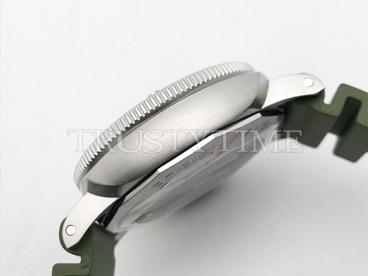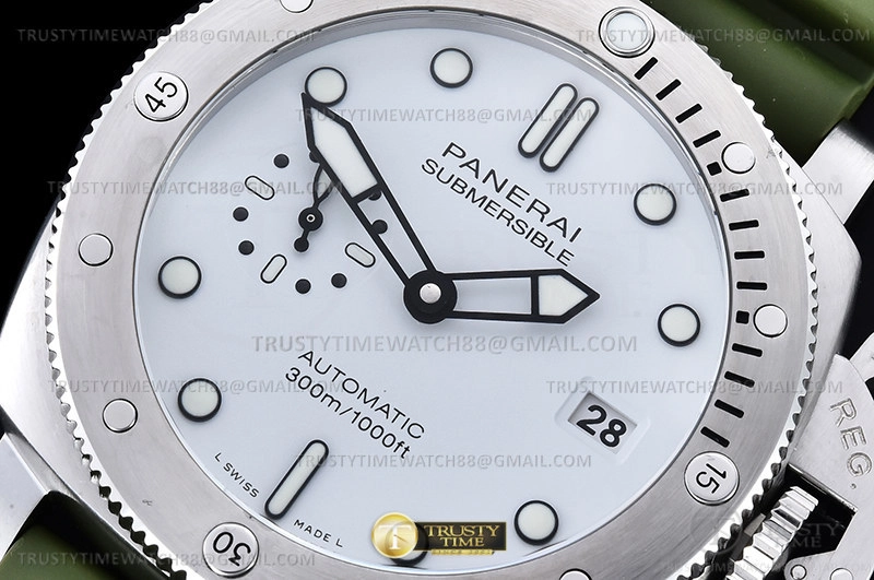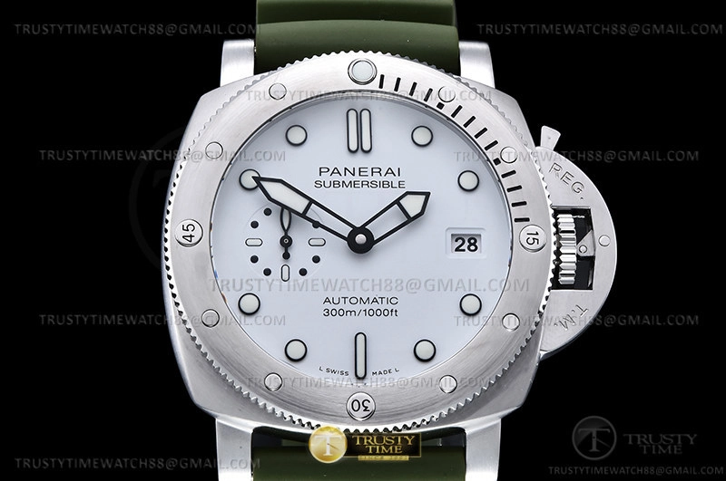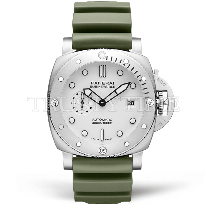 Часы Panerai из коллекции Submersible. Классические мужские часы Panerai Submersible QuarantaQuattro Bianco 44mm PAM01226 премиального качества (Артикул магазина: PN-0920) оснащены надежным автоматическим механизмом с автоподзаводом (работает от амплитуды движения руки) калибра P9010, в котором реализованы следующие функции: часовая, минутная и секундная стрелки, а так же дата. Круглый корпус часов стального цвета, имеющий размер 44 мм и высоту 16 мм превосходно дополнит образ и украсит запястье своего обладателя. Для изготовления часов Panerai Submersible QuarantaQuattro Bianco 44mm PAM01226 предлагаемых в нашем интернет-магазине, применяются нержавеющая сталь 316F высокого качества (Швейцарский стандарт), а так же сапфировое стекло высокой прочности, благодаря чему обеспечивается максимальная защита от сколов и механических повреждений. Отличительной чертой данной модели является белый циферблат, часовые индексы которого обеспечивают часовые метки. Завершает образ каучуковый ремешок зеленого цвета с фирменной классической застежкой Panerai. Водонепроницаемость данной модели составляет 30М (WR30) – допускается минимальное воздействие с водой.
