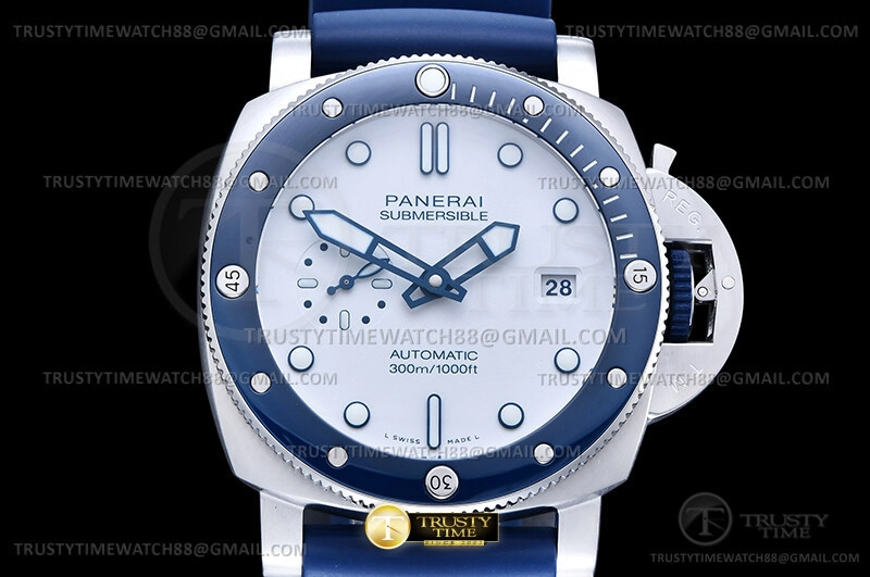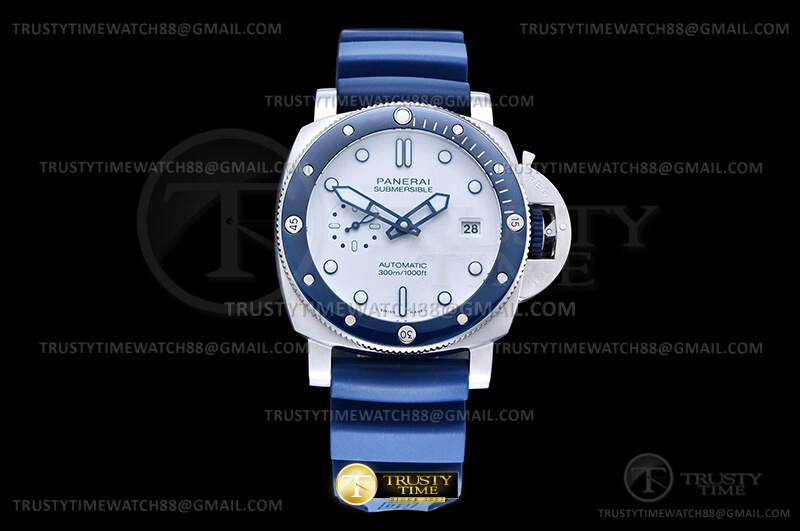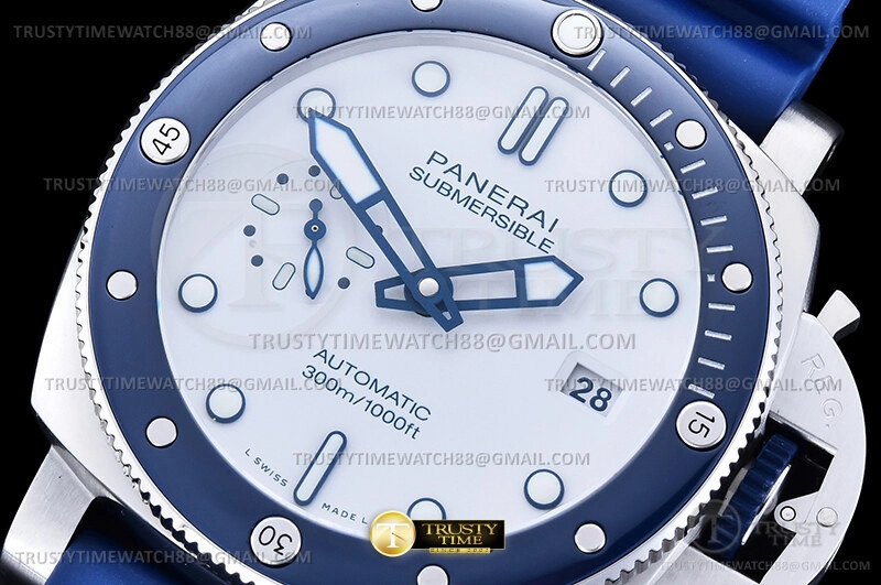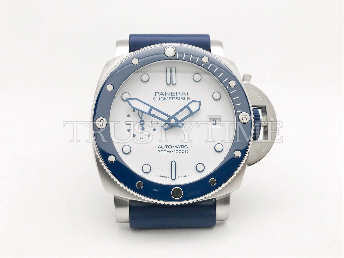 Часы Panerai из коллекции Submersible. Классические мужские часы Panerai Submersible QuarantaQuattro Aspen & Scottsdale Edition 44mm PAM01696 премиального качества (Артикул магазина: PN-0927) оснащены надежным автоматическим механизмом с автоподзаводом (работает от амплитуды движения руки) калибра P900, в котором реализованы следующие функции: часовая, минутная и секундная стрелки, а так же дата. Круглый корпус часов стального цвета, имеющий размер 44 мм и высоту 16 мм превосходно дополнит образ и украсит запястье своего обладателя. Для изготовления часов Panerai Submersible QuarantaQuattro Aspen & Scottsdale Edition 44mm PAM01696 предлагаемых в нашем интернет-магазине, применяются нержавеющая сталь 316F высокого качества (Швейцарский стандарт), а так же сапфировое стекло высокой прочности, благодаря чему обеспечивается максимальная защита от сколов и механических повреждений. Отличительной чертой данной модели является белый циферблат, часовые индексы которого обеспечивают часовые метки. Завершает образ каучуковый ремешок синего цвета с фирменной классической застежкой Panerai. Водонепроницаемость данной модели составляет 30М (WR30) – допускается минимальное воздействие с водой.