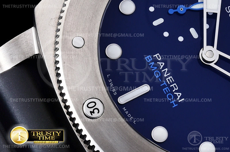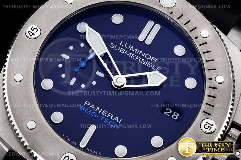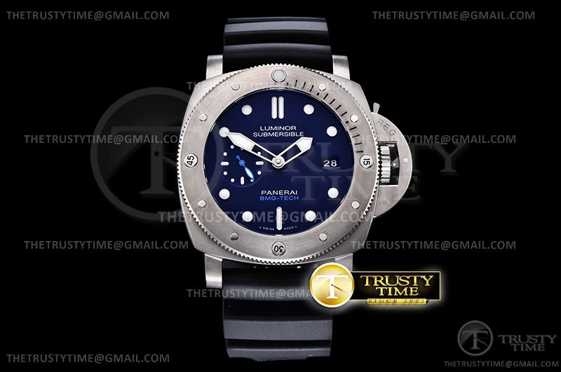 Часы Panerai из коллекции Submersible. Классические мужские часы Panerai Luminor Submersible 3 Days Automatic BMG-Tech 47mm PAM00692 премиального качества (Артикул магазина: PN-0759) оснащены надежным автоматическим механизмом с автоподзаводом (работает от амплитуды движения руки) калибра P9000, в котором реализованы следующие функции: часовая, минутная и секундная стрелки, а так же дата. Круглый корпус часов серого цвета, имеющий размер 47 мм и высоту 16.5 мм превосходно дополнит образ и украсит запястье своего обладателя. Для изготовления часов Panerai Luminor Submersible 3 Days Automatic BMG-Tech 47mm PAM00692 предлагаемых в нашем интернет-магазине, применяются титан высокого качества (Швейцарский стандарт), а так же сапфировое стекло высокой прочности, благодаря чему обеспечивается максимальная защита от сколов и механических повреждений. Отличительной чертой данной модели является синий циферблат, часовые индексы которого обеспечивают часовые метки. Завершает образ каучуковый ремешок черного цвета с фирменной классической застежкой Panerai. Водонепроницаемость данной модели составляет 30М (WR30) – допускается минимальное воздействие с водой.