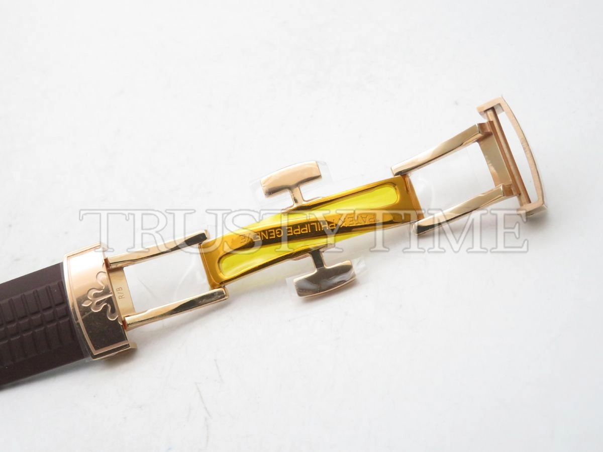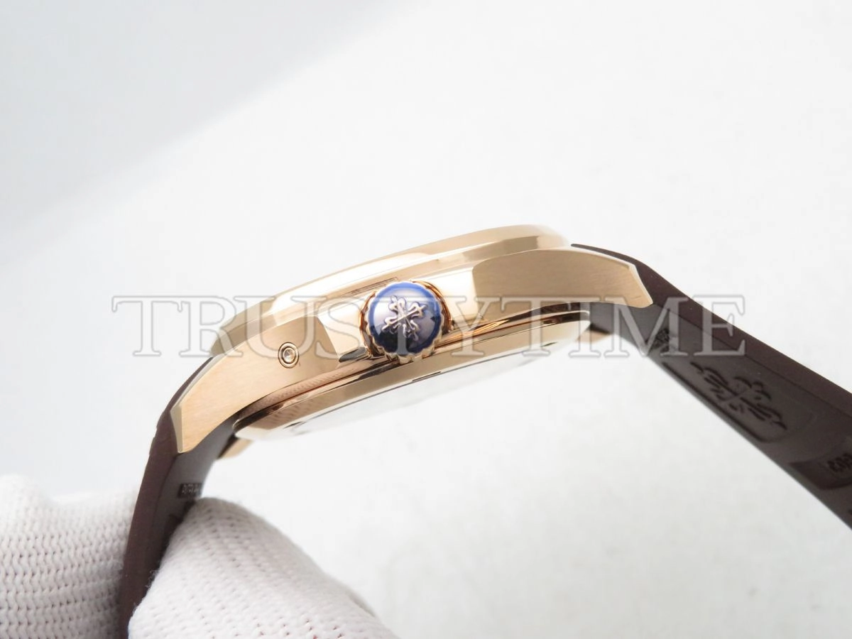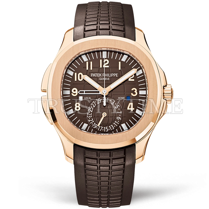 Часы Patek Philippe из коллекции Aquanaut Travel Time. Классические мужские часы Patek Philippe Aquanaut Travel Time 41mm 5164R-001 премиального качества (Артикул магазина: PP-0718) оснащены надежным автоматическим механизмом с автоподзаводом (работает от амплитуды движения руки) калибра PP324SC, в котором реализованы следующие функции: часовая, минутная и секундная стрелки, а так же дата, двойное время (GMT). Восьмиугольный корпус часов розового цвета, имеющий размер 41 мм и высоту 8.5 мм превосходно дополнит образ и украсит запястье своего обладателя. Для изготовления часов Patek Philippe Aquanaut Travel Time 41mm 5164R-001 предлагаемых в нашем интернет-магазине, применяются нержавеющая сталь 316F высокого качества (Швейцарский стандарт), а так же сапфировое стекло высокой прочности, благодаря чему обеспечивается максимальная защита от сколов и механических повреждений. Отличительной чертой данной модели является коричневый циферблат, часовые индексы которого обеспечивают арабские цифры. Завершает образ каучуковый ремешок коричневого цвета с фирменной раскладывающейся застежкой Patek Philippe. Водонепроницаемость данной модели составляет 30М (WR30) – допускается минимальное воздействие с водой.