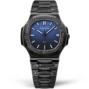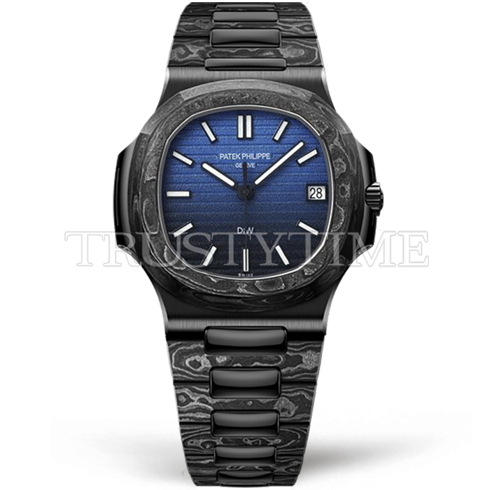 Часы Patek Philippe из коллекции Nautilus DiW. Классические мужские часы Patek Philippe Nautilus DiW The Black Grail премиального качества (Артикул магазина: PP-0811) оснащены надежным автоматическим механизмом с автоподзаводом (работает от амплитуды движения руки) калибра PP324, в котором реализованы следующие функции: часовая, минутная и секундная стрелки, а так же дата. Восьмиугольный корпус часов черного цвета, имеющий размер 40 мм и высоту 9 мм превосходно дополнит образ и украсит запястье своего обладателя. Для изготовления часов Patek Philippe Nautilus DiW The Black Grail предлагаемых в нашем интернет-магазине, применяются кованый карбон высокого качества (Швейцарский стандарт), а так же сапфировое стекло высокой прочности, благодаря чему обеспечивается максимальная защита от сколов и механических повреждений. Отличительной чертой данной модели является синий циферблат, часовые индексы которого обеспечивают часовые метки. Завершает образ браслет из натурального кованого карбона черного цвета с фирменной раскладывающейся застежкой Patek Philippe. Водонепроницаемость данной модели составляет 30М (WR30) – допускается минимальное воздействие с водой.