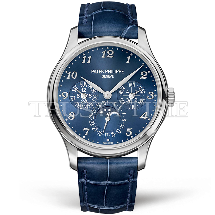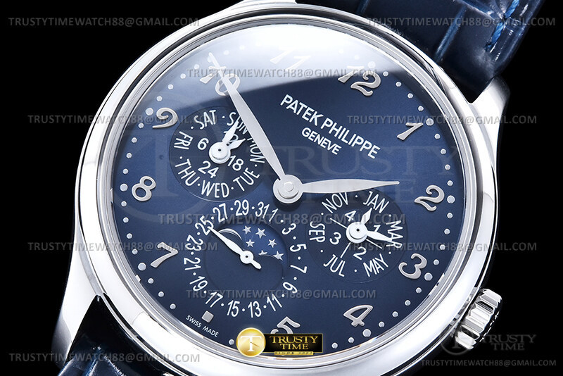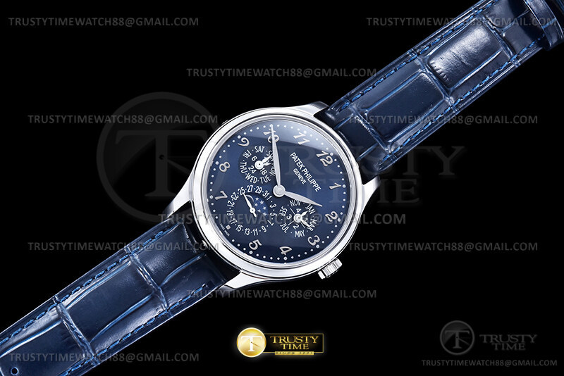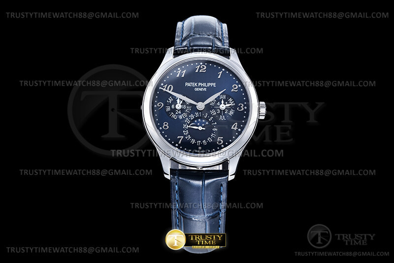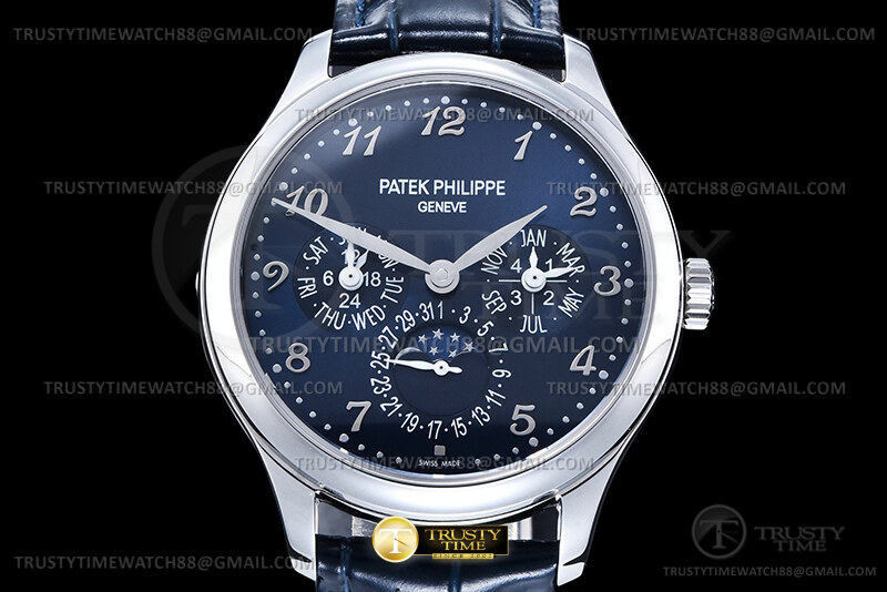 Часы Patek Philippe из коллекции Complications Perpetual Calendar. Классические мужские часы Patek Philippe Perpetual Calendar 5327G-001 премиального качества (Артикул магазина: PP-0838) оснащены надежным автоматическим механизмом с автоподзаводом (работает от амплитуды движения руки) калибра PP240, в котором реализованы следующие функции: часова и минутка стрелки, а так же дата, день недели, день-ночь, фаза луны, месяц, високосный год. Круглый корпус часов стального цвета, имеющий размер 39 мм и высоту 12.5 мм превосходно дополнит образ и украсит запястье своего обладателя. Для изготовления часов Patek Philippe Perpetual Calendar 5327G-001 предлагаемых в нашем интернет-магазине, применяются нержавеющая сталь 316L высокого качества (Швейцарский стандарт), а так же сапфировое стекло высокой прочности, благодаря чему обеспечивается максимальная защита от сколов и механических повреждений. Отличительной чертой данной модели является синий циферблат, часовые индексы которого обеспечивают арабские цифры. Завершает образ кожаный ремешок синего цвета с фирменной раскладывающейся застежкой Patek Philippe. Водонепроницаемость данной модели составляет 30М (WR30) – допускается минимальное воздействие с водой.