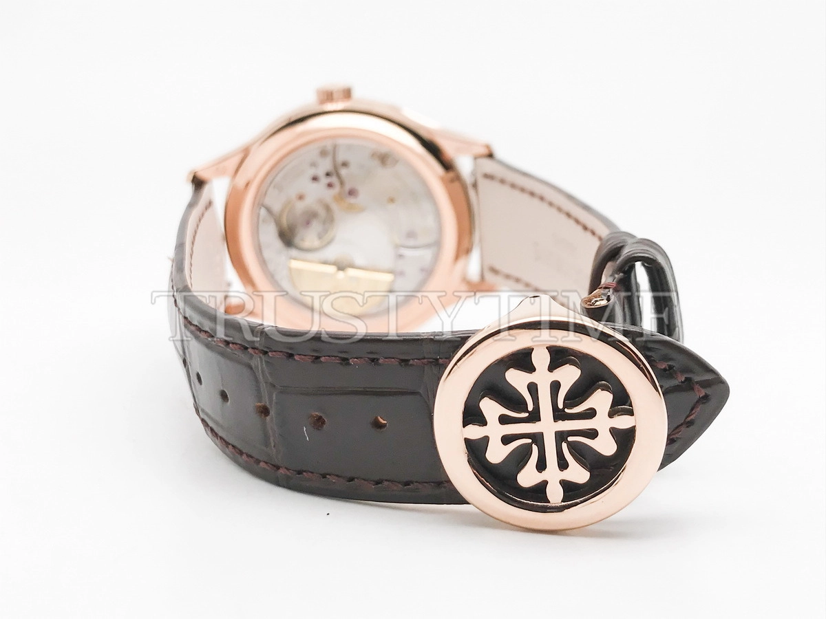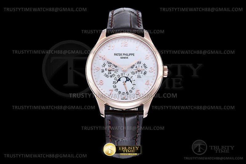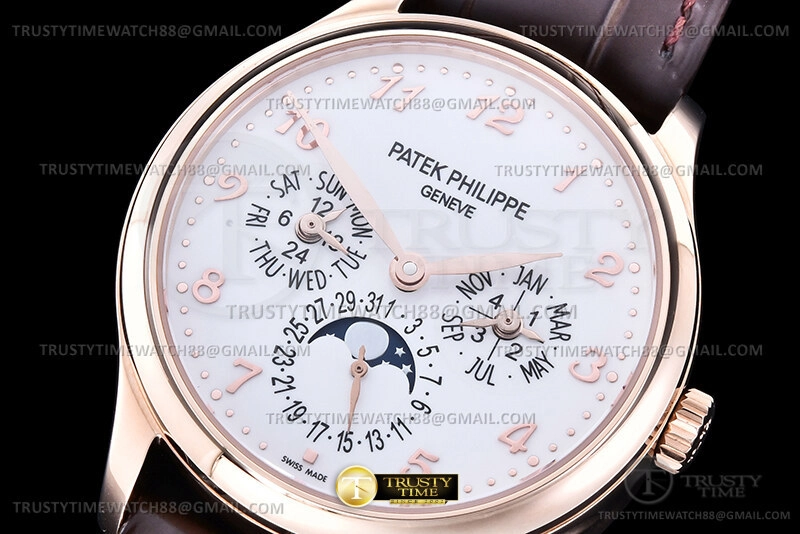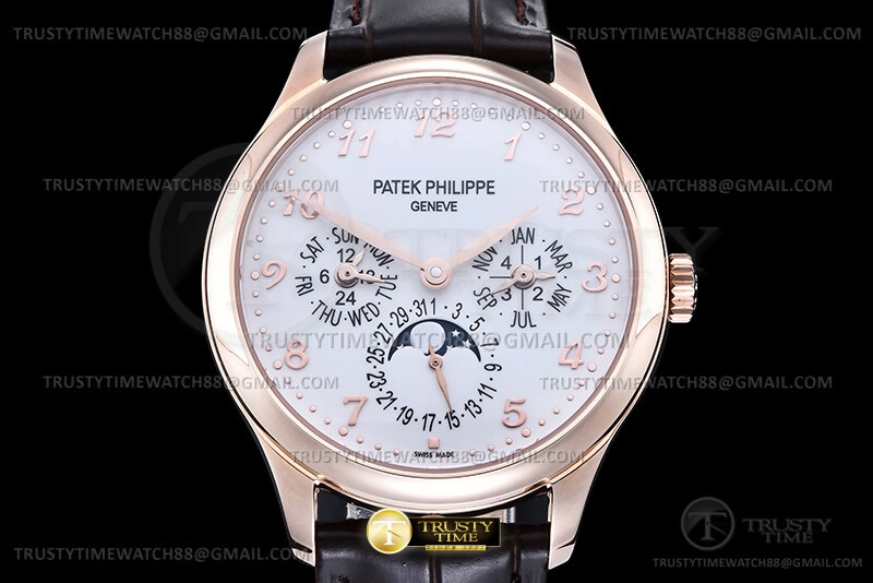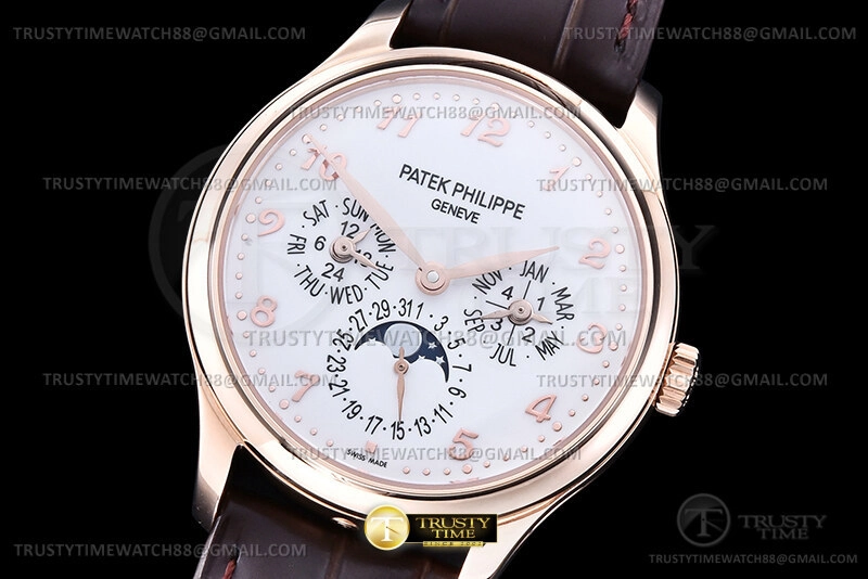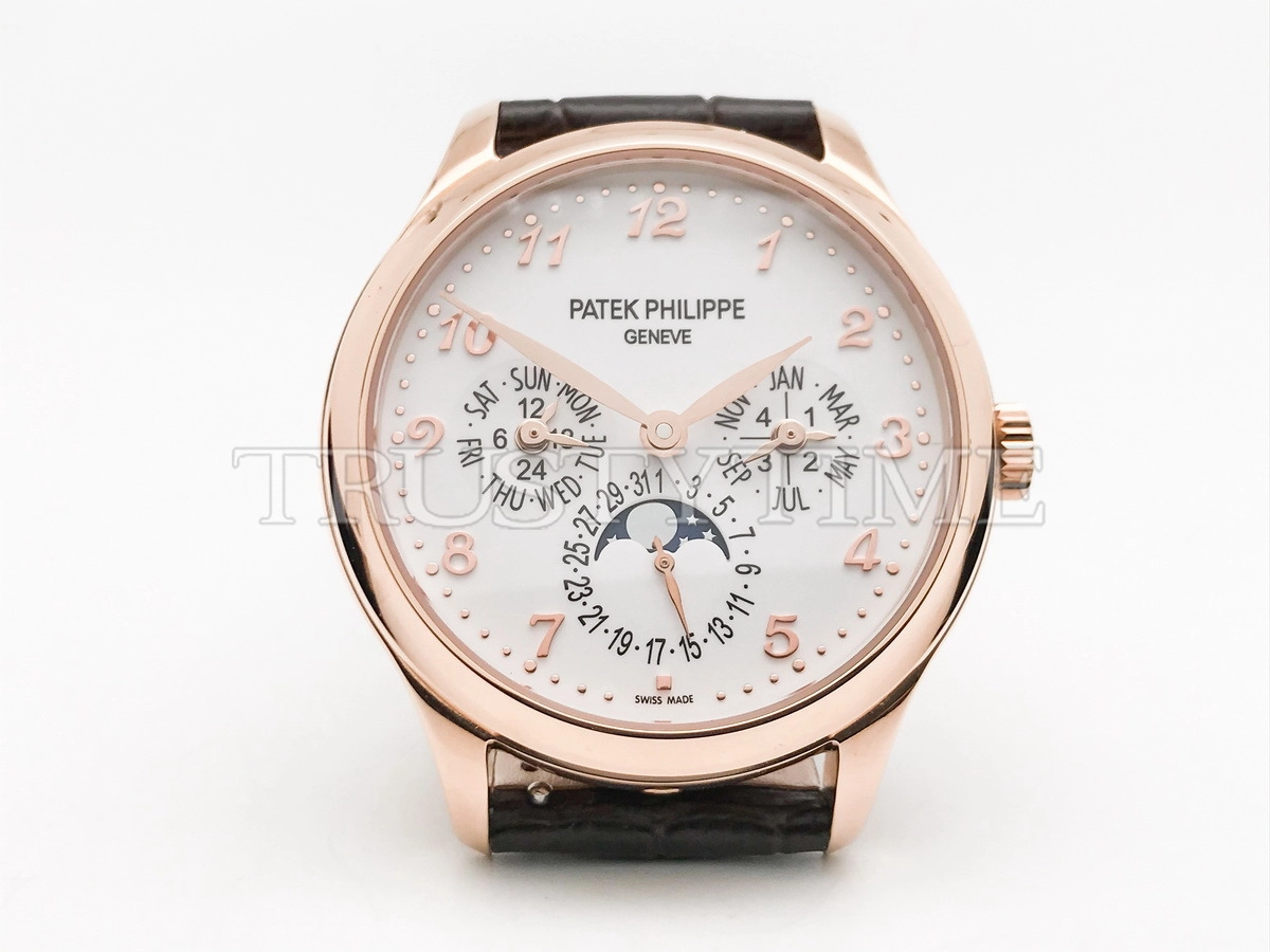 Часы Patek Philippe из коллекции Complications Perpetual Calendar. Классические мужские часы Patek Philippe Perpetual Calendar 5327R-001 премиального качества (Артикул магазина: PP-0836) оснащены надежным автоматическим механизмом с автоподзаводом (работает от амплитуды движения руки) калибра PP240, в котором реализованы следующие функции: часова и минутка стрелки, а так же дата, день недели, день-ночь, фаза луны, месяц, високосный год. Круглый корпус часов розового цвета, имеющий размер 39 мм и высоту 12.5 мм превосходно дополнит образ и украсит запястье своего обладателя. Для изготовления часов Patek Philippe Perpetual Calendar 5327R-001 предлагаемых в нашем интернет-магазине, применяются нержавеющая сталь 316L высокого качества (Швейцарский стандарт), а так же сапфировое стекло высокой прочности, благодаря чему обеспечивается максимальная защита от сколов и механических повреждений. Отличительной чертой данной модели является белый циферблат, часовые индексы которого обеспечивают арабские цифры. Завершает образ кожаный ремешок коричневого цвета с фирменной раскладывающейся застежкой Patek Philippe. Водонепроницаемость данной модели составляет 30М (WR30) – допускается минимальное воздействие с водой.