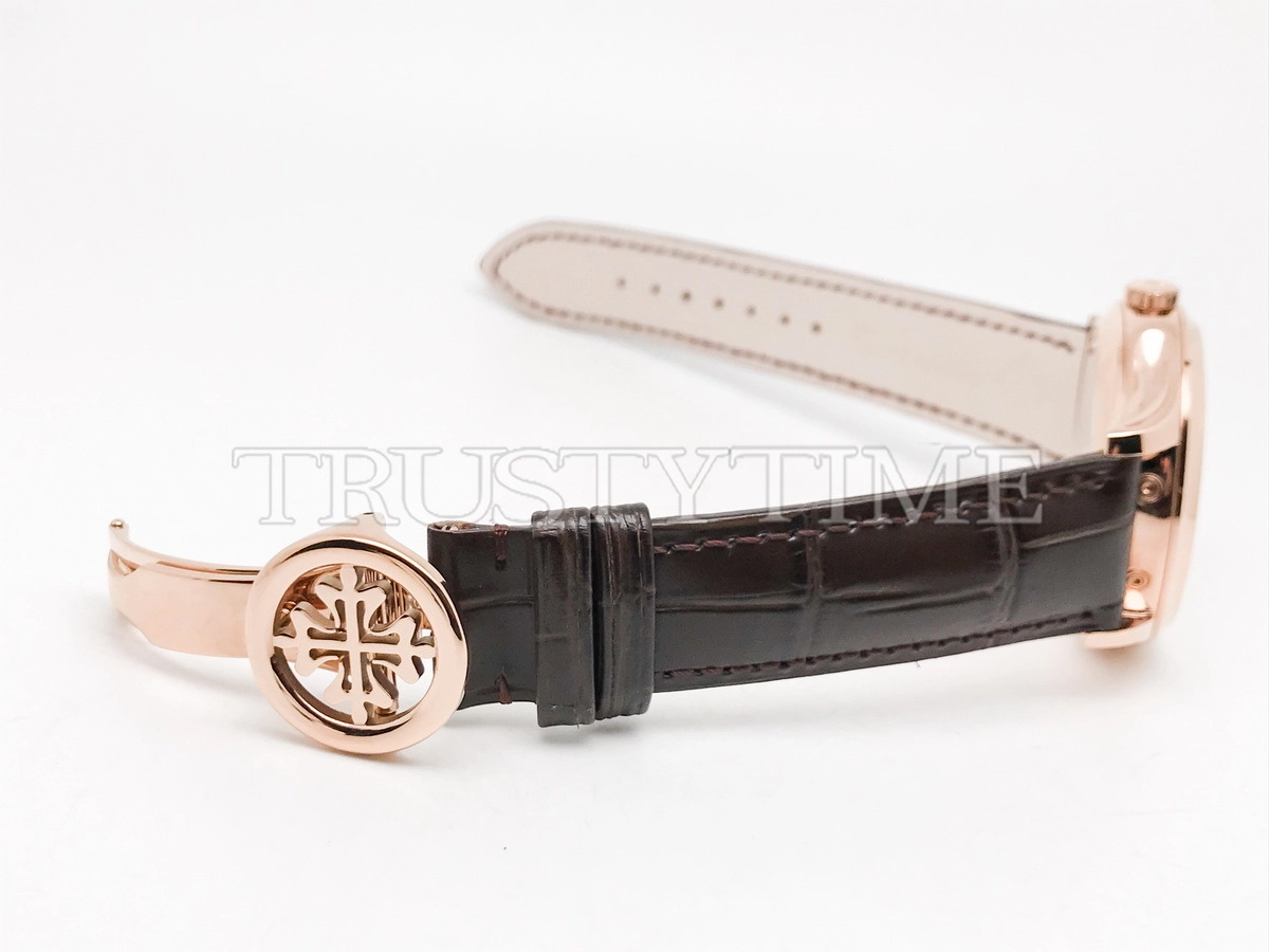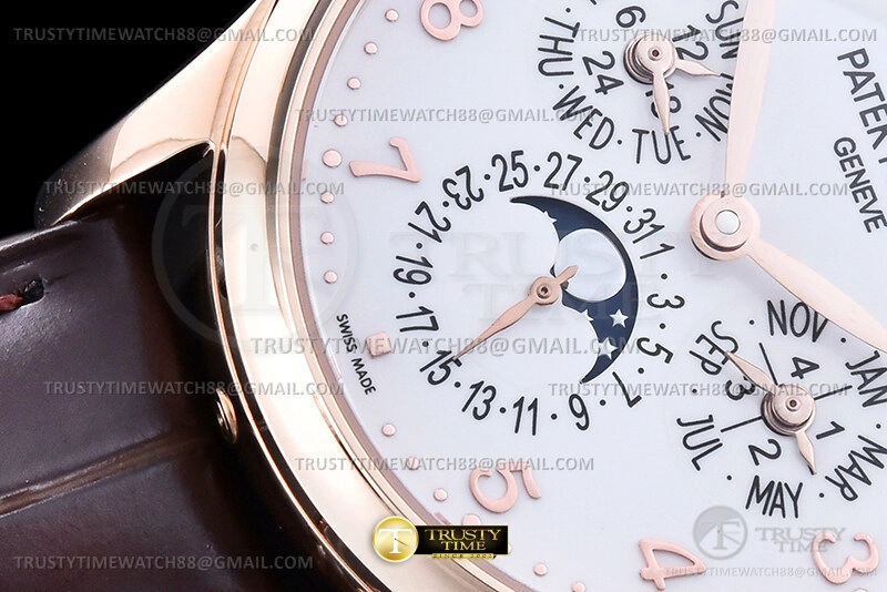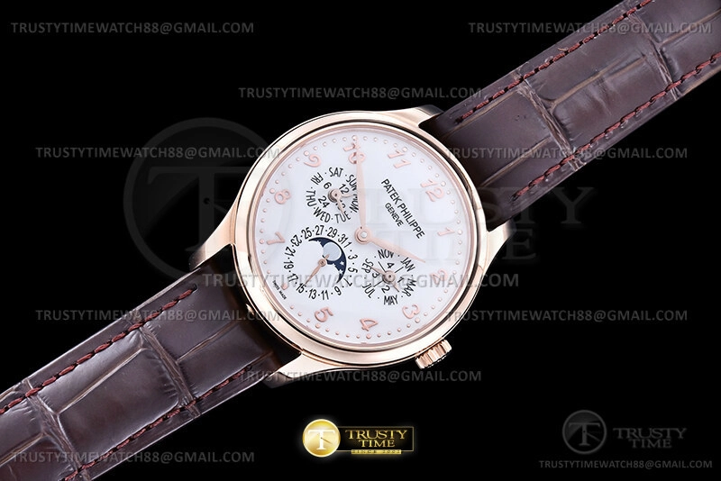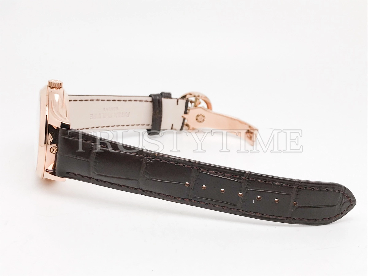 Часы Patek Philippe из коллекции Complications Perpetual Calendar. Классические мужские часы Patek Philippe Perpetual Calendar 5327R-001 премиального качества (Артикул магазина: PP-0836) оснащены надежным автоматическим механизмом с автоподзаводом (работает от амплитуды движения руки) калибра PP240, в котором реализованы следующие функции: часова и минутка стрелки, а так же дата, день недели, день-ночь, фаза луны, месяц, високосный год. Круглый корпус часов розового цвета, имеющий размер 39 мм и высоту 12.5 мм превосходно дополнит образ и украсит запястье своего обладателя. Для изготовления часов Patek Philippe Perpetual Calendar 5327R-001 предлагаемых в нашем интернет-магазине, применяются нержавеющая сталь 316L высокого качества (Швейцарский стандарт), а так же сапфировое стекло высокой прочности, благодаря чему обеспечивается максимальная защита от сколов и механических повреждений. Отличительной чертой данной модели является белый циферблат, часовые индексы которого обеспечивают арабские цифры. Завершает образ кожаный ремешок коричневого цвета с фирменной раскладывающейся застежкой Patek Philippe. Водонепроницаемость данной модели составляет 30М (WR30) – допускается минимальное воздействие с водой.