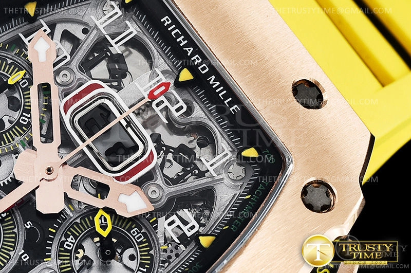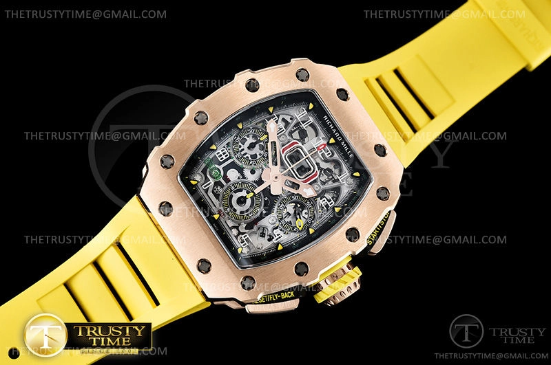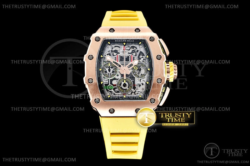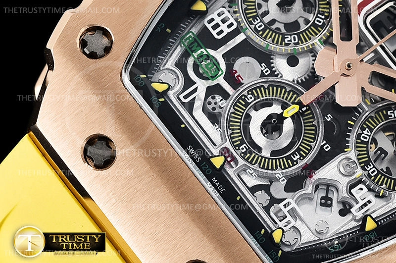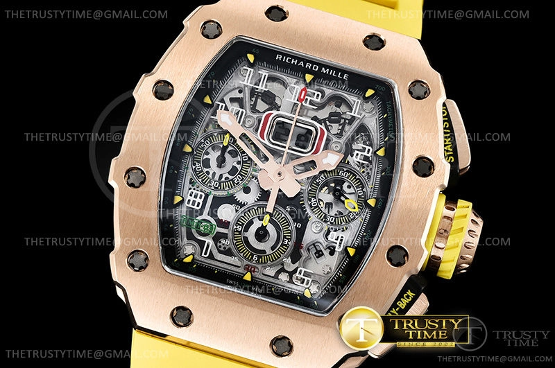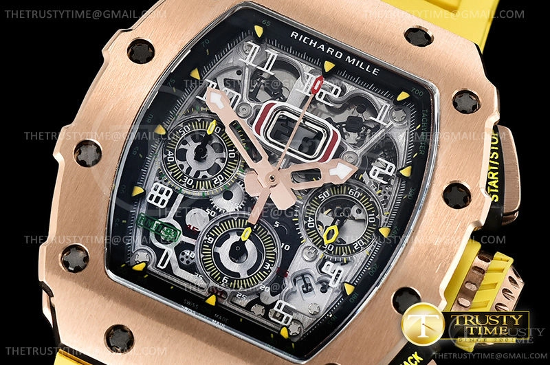 Часы Richard Mille из коллекции RM011. Спортивные мужские часы Richard Mille RM011-03 Felipe Massa Skeleton премиального качества (Артикул магазина: RM-0228) оснащены надежным автоматическим механизмом с автоподзаводом (работает от амплитуды движения руки) калибра Valjoux-7750, в котором реализованы следующие функции: часовая, минутная и секундная стрелки, а так же хронограф, дата. Бочкообразный корпус часов розового цвета, имеющий размер 43 мм и высоту 19 мм превосходно дополнит образ и украсит запястье своего обладателя. Для изготовления часов Richard Mille RM011-03 Felipe Massa Skeleton предлагаемых в нашем интернет-магазине, применяются нержавеющая сталь 316L высокого качества (Швейцарский стандарт), а так же сапфировое стекло высокой прочности, благодаря чему обеспечивается максимальная защита от сколов и механических повреждений. Отличительной чертой данной модели является скелетонизированный циферблат, часовые индексы которого обеспечивают арабские цифры. Завершает образ каучуковый ремешок желтого цвета с фирменной раскладывающейся застежкой Richard Mille. Водонепроницаемость данной модели составляет 30М (WR30) – допускается минимальное воздействие с водой.