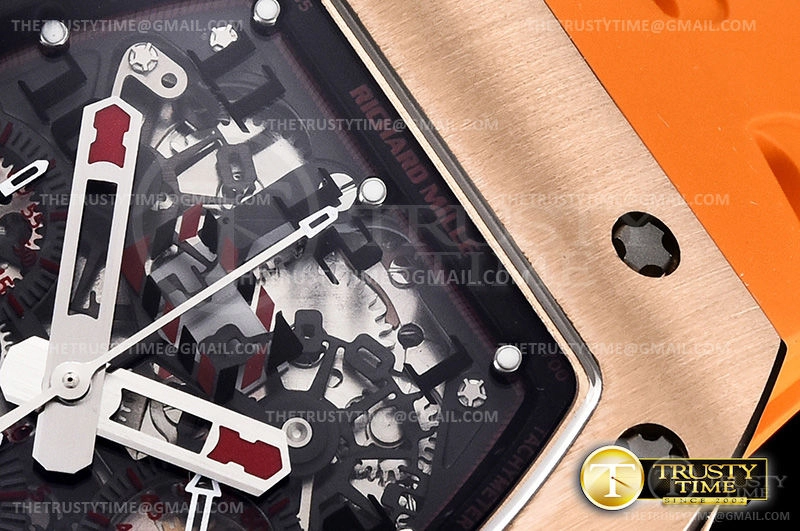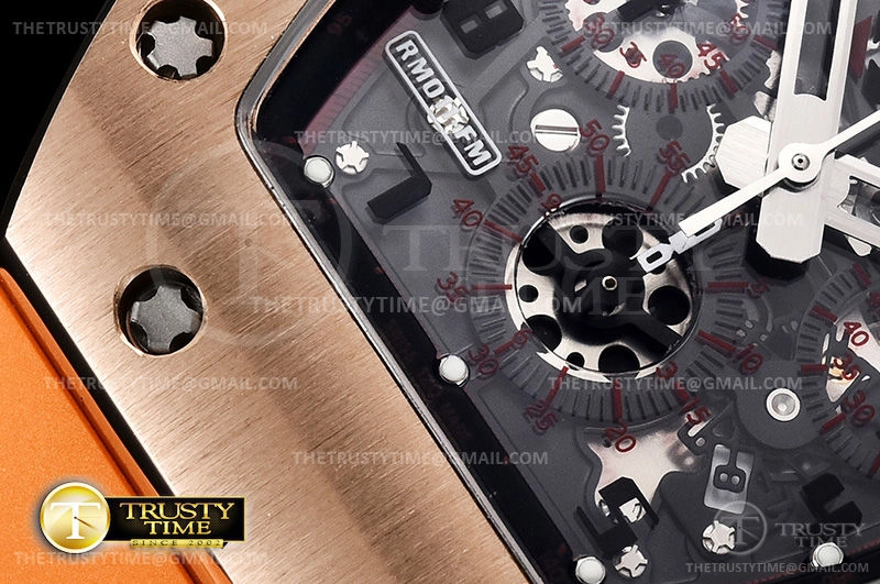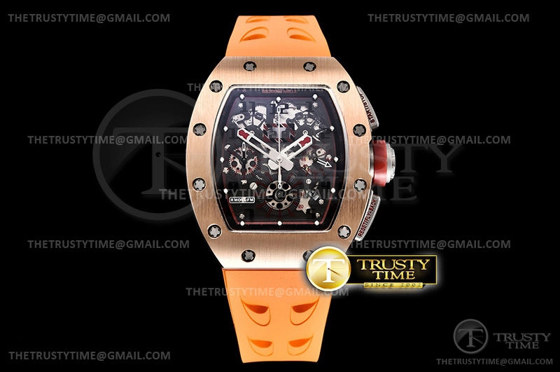 Часы Richard Mille из коллекции RM011. Спортивные мужские часы Richard Mille RM011-03 Flyback Chronograph Felipe M премиального качества (Артикул магазина: RM-0197) оснащены надежным автоматическим механизмом с автоподзаводом (работает от амплитуды движения руки) калибра Valjoux-7750, в котором реализованы следующие функции: часовая, минутная и секундная стрелки, а так же хронограф, дата. Бочкообразный корпус часов розового цвета, имеющий размер 43 мм и высоту 19 мм превосходно дополнит образ и украсит запястье своего обладателя. Для изготовления часов Richard Mille RM011-03 Flyback Chronograph Felipe M предлагаемых в нашем интернет-магазине, применяются нержавеющая сталь 316F высокого качества (Швейцарский стандарт), а так же сапфировое стекло высокой прочности, благодаря чему обеспечивается максимальная защита от сколов и механических повреждений. Отличительной чертой данной модели является скелетонизированный циферблат, часовые индексы которого обеспечивают часовые метки. Завершает образ каучуковый ремешок оранжевого цвета с фирменной раскладывающейся застежкой Richard Mille. Водонепроницаемость данной модели составляет 30М (WR30) – допускается минимальное воздействие с водой.
