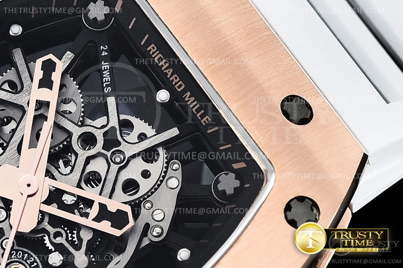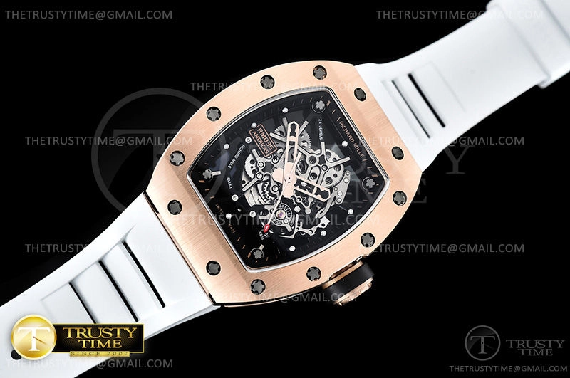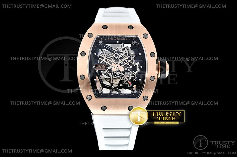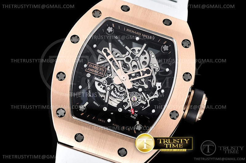 Часы Richard Mille из коллекции RM035. Спортивные мужские часы Richard Mille RM035-02 Americas Skeleton премиального качества (Артикул магазина: RM-0347) оснащены надежным автоматическим механизмом с автоподзаводом (работает от амплитуды движения руки) калибра MY8215, в котором реализованы следующие функции: часовая, минутная и секундная стрелки, а так же максимально простой функционал без усложнений. Бочкообразный корпус часов розового цвета, имеющий размер 43 мм X 50 мм и высоту 16.5 мм превосходно дополнит образ и украсит запястье своего обладателя. Для изготовления часов Richard Mille RM035-02 Americas Skeleton предлагаемых в нашем интернет-магазине, применяются нержавеющая сталь 316F высокого качества (Швейцарский стандарт), а так же сапфировое стекло высокой прочности, благодаря чему обеспечивается максимальная защита от сколов и механических повреждений. Отличительной чертой данной модели является скелетонизированный циферблат, часовые индексы которого обеспечивают часовые метки. Завершает образ каучуковый ремешок белого цвета с фирменной раскладывающейся застежкой Richard Mille. Водонепроницаемость данной модели составляет 30М (WR30) – допускается минимальное воздействие с водой.