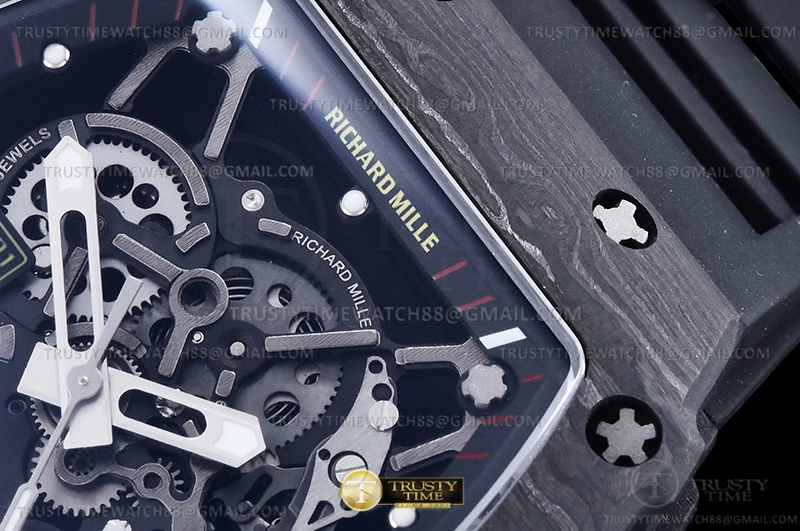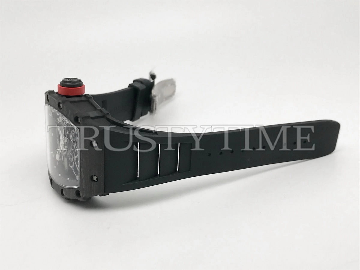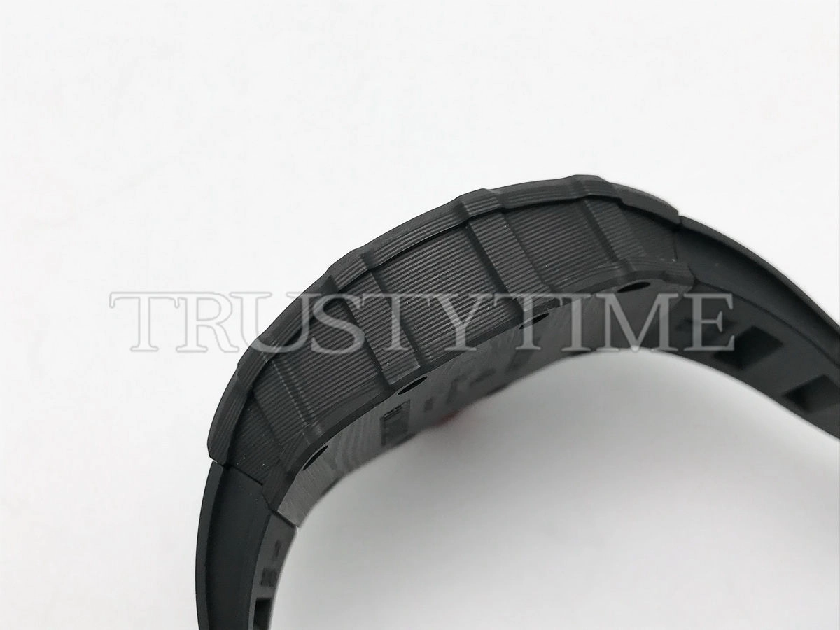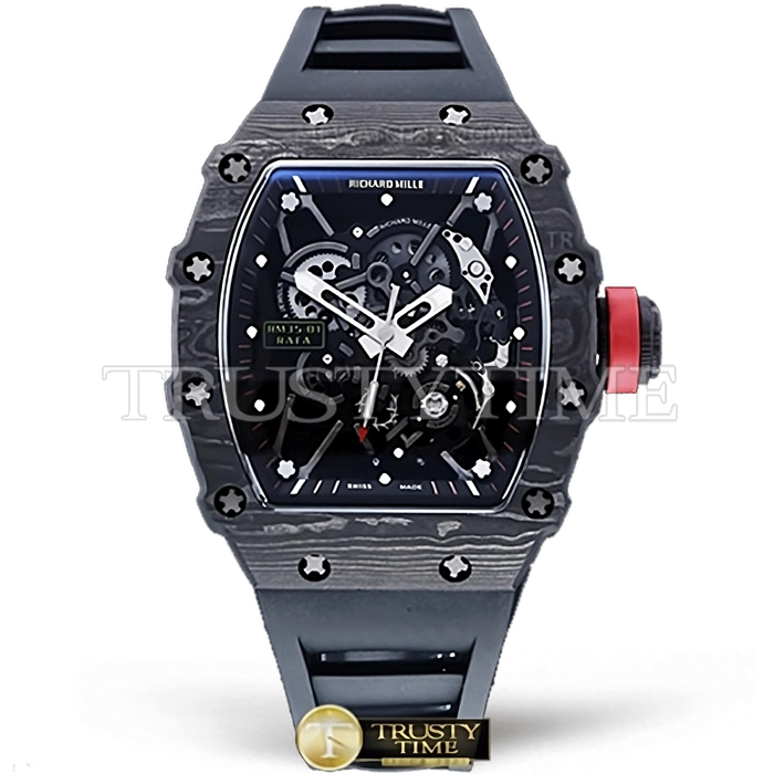 Часы Richard Mille из коллекции RM035. Спортивные мужские часы Richard Mille RM035-01 Rafael Nadal премиального качества (Артикул магазина: RM-0581) оснащены надежным автоматическим механизмом с ручным заводом калибра RMUL3, в котором реализованы следующие функции: часовая, минутная и секундная стрелки, а так же максимально простой функционал без усложнений. Бочкообразный корпус часов черного цвета, имеющий размер 50 мм x 43 мм и высоту 14 мм превосходно дополнит образ и украсит запястье своего обладателя. Для изготовления часов Richard Mille RM035-01 Rafael Nadal предлагаемых в нашем интернет-магазине, применяются карбон NTPT высокого качества (Швейцарский стандарт), а так же сапфировое стекло высокой прочности, благодаря чему обеспечивается максимальная защита от сколов и механических повреждений. Отличительной чертой данной модели является скелетонизированный циферблат, часовые индексы которого обеспечивают часовые метки. Завершает образ каучуковый ремешок черного цвета с фирменной раскладывающейся застежкой Richard Mille. Водонепроницаемость данной модели составляет 30М (WR30) – допускается минимальное воздействие с водой.