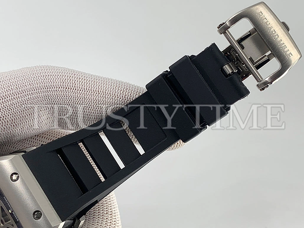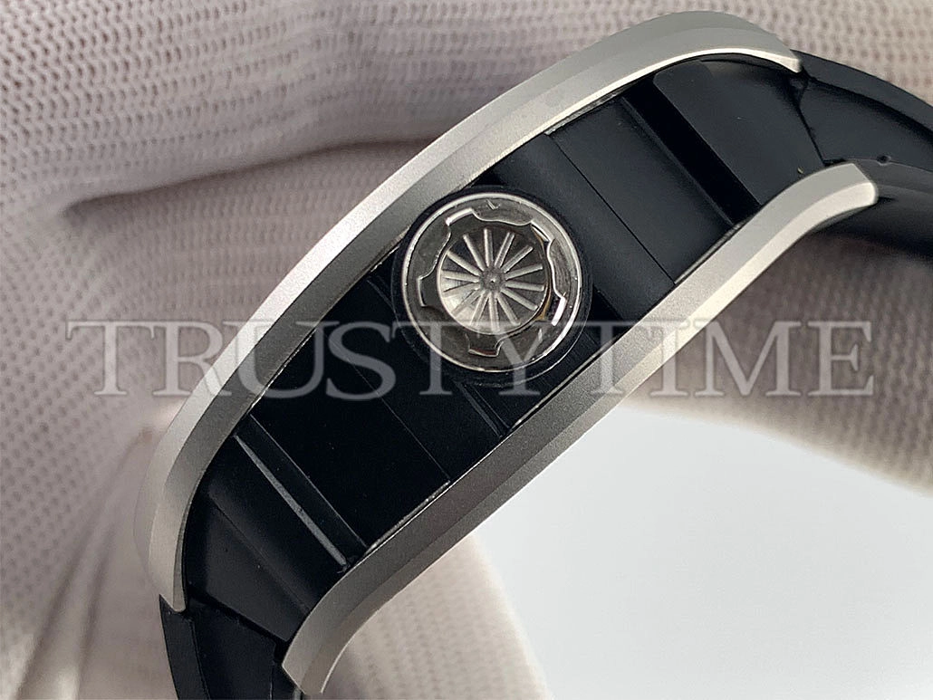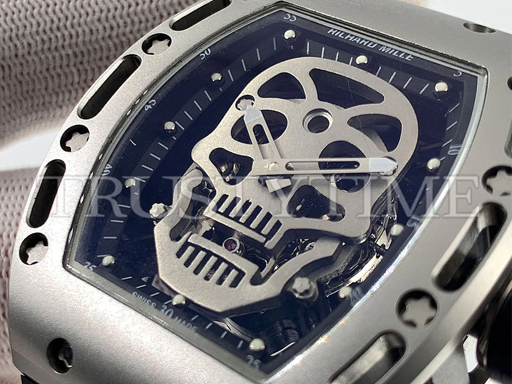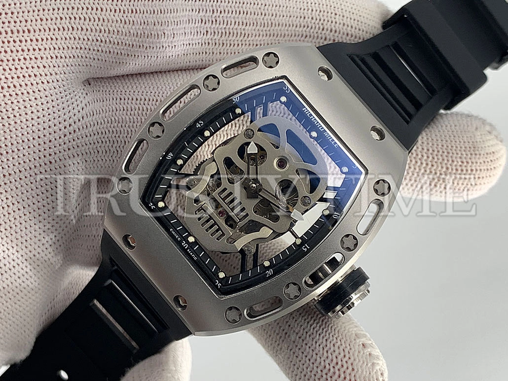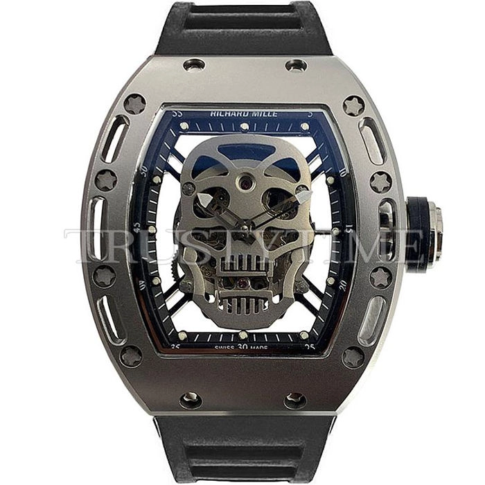 Часы Richard Mille из коллекции RM052. Спортивные мужские часы Richard Mille RM052 Skeleton качества ААА+ (Артикул магазина: RM-0026) оснащены надежным автоматическим механизмом с автоподзаводом (работает от амплитуды движения руки) калибра Miyota, в котором реализованы следующие функции: часова и минутка стрелки, а так же максимально простой функционал без усложнений. Бочкообразный корпус часов стального цвета, имеющий размер 43 мм X 50 мм и высоту 18 мм превосходно дополнит образ и украсит запястье своего обладателя. Для изготовления часов Richard Mille RM052 Skeleton предлагаемых в нашем интернет-магазине, применяются нержавеющая сталь 316F высокого качества (Швейцарский стандарт), а так же сапфировое стекло высокой прочности, благодаря чему обеспечивается максимальная защита от сколов и механических повреждений. Отличительной чертой данной модели является скелетонизированный циферблат, часовые индексы которого обеспечивают часовые метки. Завершает образ каучуковый ремешок черного цвета с фирменной раскладывающейся застежкой Richard Mille. Водонепроницаемость данной модели составляет 30М (WR30) – допускается минимальное воздействие с водой.