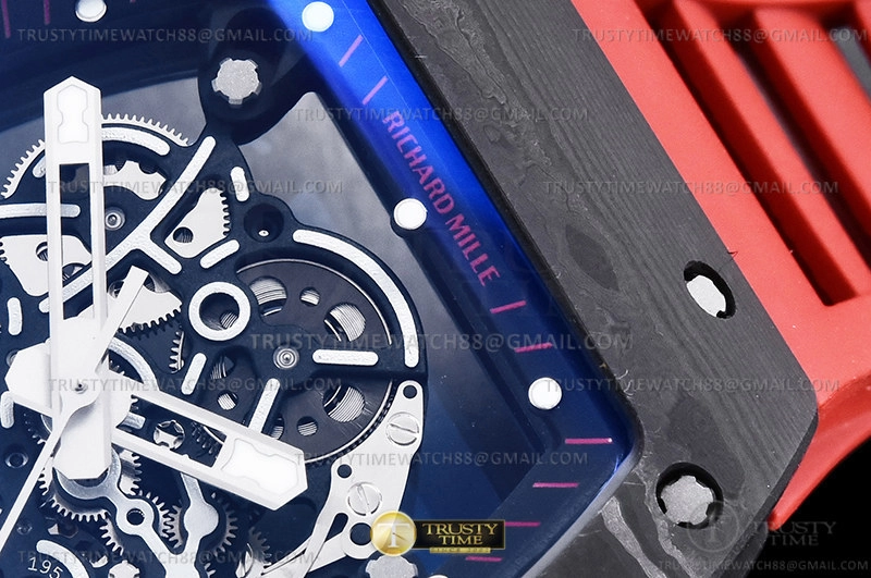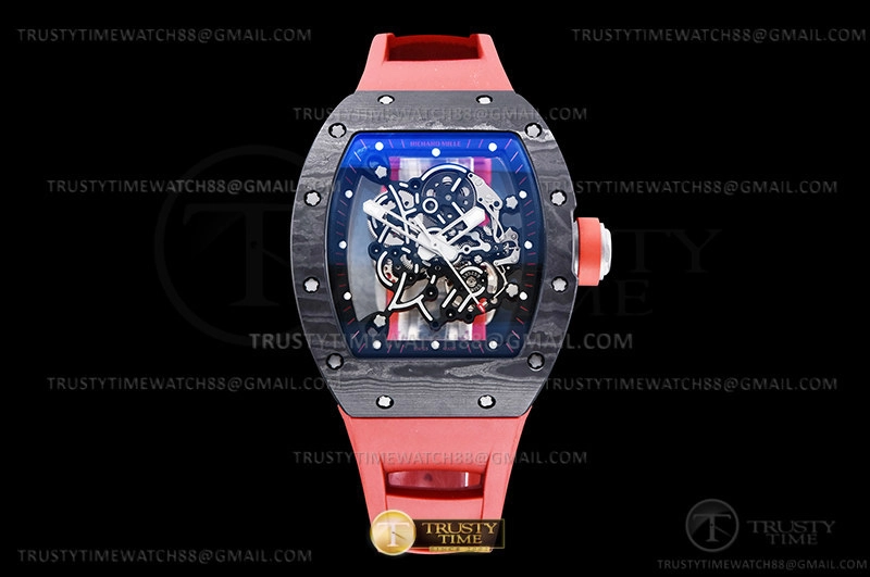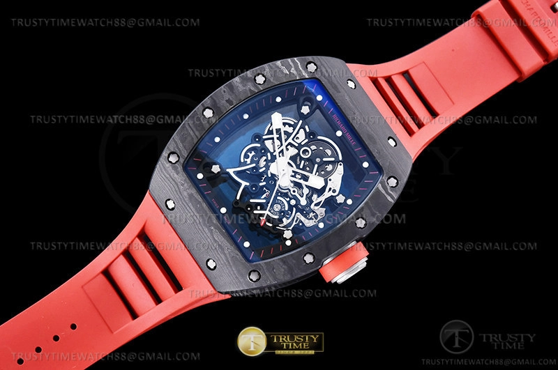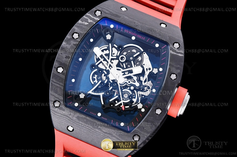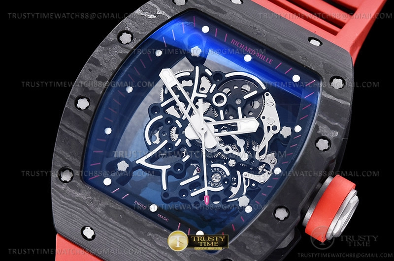 Часы Richard Mille из коллекции RM055. Спортивные мужские часы Richard Mille RM055 Bubba Watson премиального качества (Артикул магазина: RM-0593) оснащены надежным автоматическим механизмом с ручным заводом калибра RMUL2, в котором реализованы следующие функции: часовая, минутная и секундная стрелки, а так же максимально простой функционал без усложнений. Бочкообразный корпус часов черного цвета, имеющий размер 49.9 мм x 42.7 мм и высоту 13.5 мм превосходно дополнит образ и украсит запястье своего обладателя. Для изготовления часов Richard Mille RM055 Bubba Watson предлагаемых в нашем интернет-магазине, применяются карбон NTPT высокого качества (Швейцарский стандарт), а так же сапфировое стекло высокой прочности, благодаря чему обеспечивается максимальная защита от сколов и механических повреждений. Отличительной чертой данной модели является скелетонизированный циферблат, часовые индексы которого обеспечивают часовые метки. Завершает образ каучуковый ремешок красного цвета с фирменной раскладывающейся застежкой Richard Mille. Водонепроницаемость данной модели составляет 30М (WR30) – допускается минимальное воздействие с водой.