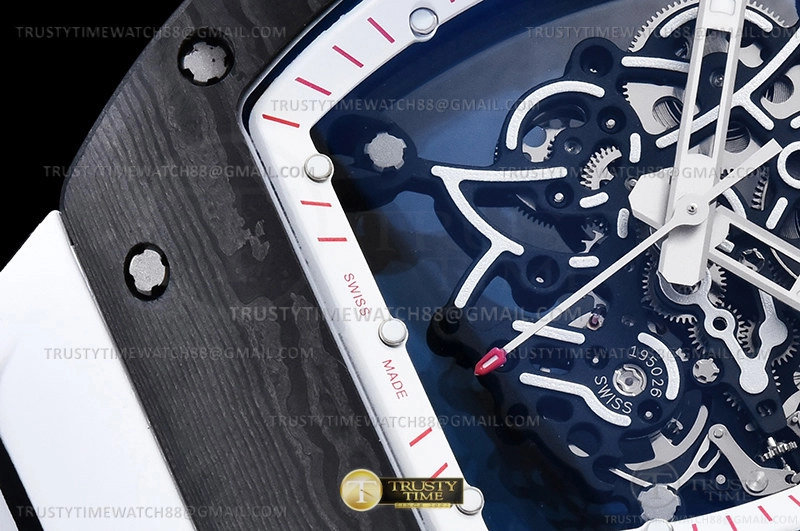 Часы Richard Mille из коллекции RM055. Спортивные мужские часы Richard Mille RM055 Bubba Watson премиального качества (Артикул магазина: RM-0594) оснащены надежным автоматическим механизмом с ручным заводом калибра RMUL2, в котором реализованы следующие функции: часовая, минутная и секундная стрелки, а так же максимально простой функционал без усложнений. Бочкообразный корпус часов черного цвета, имеющий размер 49.9 мм x 42.7 мм и высоту 13.5 мм превосходно дополнит образ и украсит запястье своего обладателя. Для изготовления часов Richard Mille RM055 Bubba Watson предлагаемых в нашем интернет-магазине, применяются карбон NTPT высокого качества (Швейцарский стандарт), а так же сапфировое стекло высокой прочности, благодаря чему обеспечивается максимальная защита от сколов и механических повреждений. Отличительной чертой данной модели является скелетонизированный циферблат, часовые индексы которого обеспечивают часовые метки. Завершает образ каучуковый ремешок белого цвета с фирменной раскладывающейся застежкой Richard Mille. Водонепроницаемость данной модели составляет 30М (WR30) – допускается минимальное воздействие с водой.