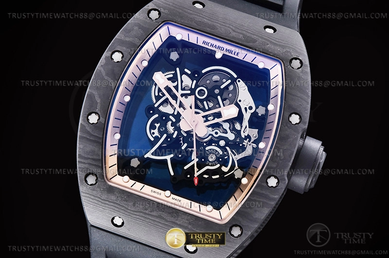 Часы Richard Mille из коллекции RM055. Спортивные мужские часы Richard Mille RM055 Bubba Watson премиального качества (Артикул магазина: RM-0598) оснащены надежным автоматическим механизмом с ручным заводом калибра RMUL2, в котором реализованы следующие функции: часовая, минутная и секундная стрелки, а так же максимально простой функционал без усложнений. Бочкообразный корпус часов черного цвета, имеющий размер 49.9 мм x 42.7 мм и высоту 13.5 мм превосходно дополнит образ и украсит запястье своего обладателя. Для изготовления часов Richard Mille RM055 Bubba Watson предлагаемых в нашем интернет-магазине, применяются карбон NTPT высокого качества (Швейцарский стандарт), а так же сапфировое стекло высокой прочности, благодаря чему обеспечивается максимальная защита от сколов и механических повреждений. Отличительной чертой данной модели является скелетонизированный циферблат, часовые индексы которого обеспечивают часовые метки. Завершает образ каучуковый ремешок черного цвета с фирменной раскладывающейся застежкой Richard Mille. Водонепроницаемость данной модели составляет 30М (WR30) – допускается минимальное воздействие с водой.
