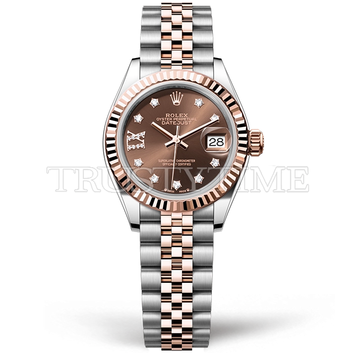 Часы Rolex из коллекции DateJust. Классические женские часы Rolex DateJust 28mm 279171-0003 премиального качества (Артикул магазина: RX-2883) оснащены надежным автоматическим механизмом с автоподзаводом (работает от амплитуды движения руки) калибра ETA2671, в котором реализованы следующие функции: часовая, минутная и секундная стрелки, а так же дата. Круглый корпус часов комбинированного сталь с розового золота цвета, имеющий размер 28 мм и высоту 11 мм превосходно дополнит образ и украсит запястье своего обладателя. Для изготовления часов Rolex DateJust 28mm 279171-0003 предлагаемых в нашем интернет-магазине, применяются нержавеющая сталь 904L высокого качества (Швейцарский стандарт), а так же сапфировое стекло высокой прочности, благодаря чему обеспечивается максимальная защита от сколов и механических повреждений. Отличительной чертой данной модели является коричневый циферблат, часовые индексы которого обеспечивают камни. Завершает образ браслет из нержавеющей стали комбинированного сталь с розовым золотом цвета с фирменной раскладывающейся застежкой Rolex. Водонепроницаемость данной модели составляет 30М (WR30) – допускается минимальное воздействие с водой.