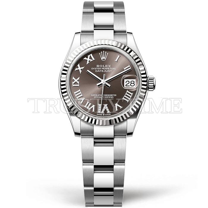 Часы Rolex из коллекции DateJust. Классические женские часы Rolex DateJust 31mm 278274-0027 премиального качества (Артикул магазина: RX-3024) оснащены надежным автоматическим механизмом с автоподзаводом (работает от амплитуды движения руки) калибра ETA2836-2, в котором реализованы следующие функции: часовая, минутная и секундная стрелки, а так же дата. Круглый корпус часов стального цвета, имеющий размер 31 мм и высоту 12 мм превосходно дополнит образ и украсит запястье своего обладателя. Для изготовления часов Rolex DateJust 31mm 278274-0027 предлагаемых в нашем интернет-магазине, применяются нержавеющая сталь 316F высокого качества (Швейцарский стандарт), а так же сапфировое стекло высокой прочности, благодаря чему обеспечивается максимальная защита от сколов и механических повреждений. Отличительной чертой данной модели является серый циферблат, часовые индексы которого обеспечивают римские цифры. Завершает образ браслет из нержавеющей стали стального цвета с фирменной раскладывающейся застежкой Rolex. Водонепроницаемость данной модели составляет 30М (WR30) – допускается минимальное воздействие с водой.