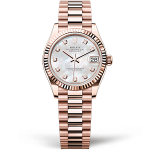 Часы Rolex из коллекции DateJust. Классические женские часы Rolex DateJust 31mm 278275-0009 премиального качества (Артикул магазина: RX-3283) оснащены надежным автоматическим механизмом с автоподзаводом (работает от амплитуды движения руки) калибра ETA2824-2, в котором реализованы следующие функции: часовая, минутная и секундная стрелки, а так же дата. Круглый корпус часов розового цвета, имеющий размер 31 мм и высоту 12 мм превосходно дополнит образ и украсит запястье своего обладателя. Для изготовления часов Rolex DateJust 31mm 278275-0009 предлагаемых в нашем интернет-магазине, применяются нержавеющая сталь 316F высокого качества (Швейцарский стандарт), а так же сапфировое стекло высокой прочности, благодаря чему обеспечивается максимальная защита от сколов и механических повреждений. Отличительной чертой данной модели является перламутровый циферблат, часовые индексы которого обеспечивают камни. Завершает образ браслет из нержавеющей стали цвета розового золота с фирменной раскладывающейся застежкой Rolex. Водонепроницаемость данной модели составляет 30М (WR30) – допускается минимальное воздействие с водой.