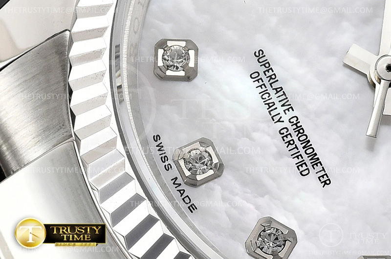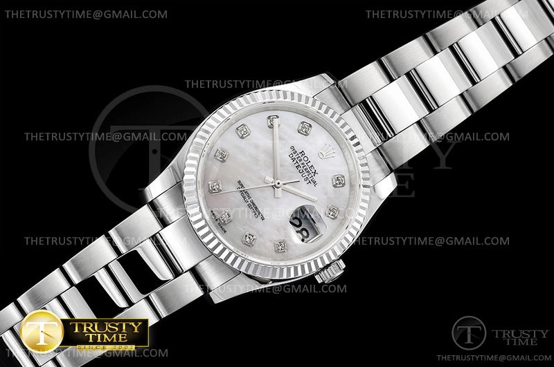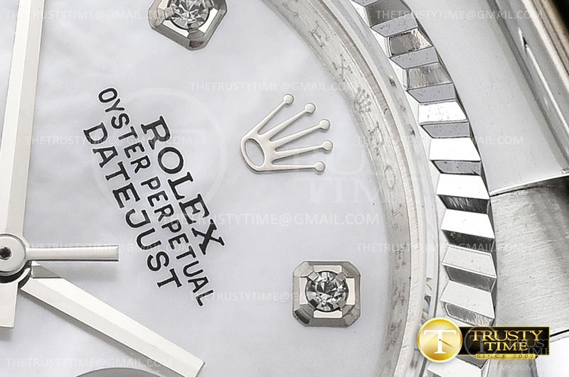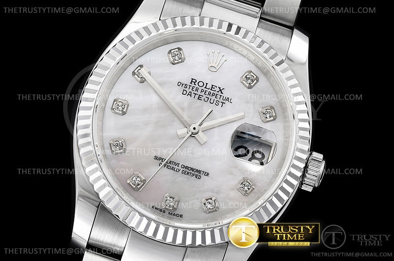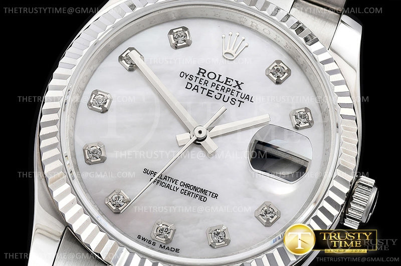 Часы Rolex из коллекции DateJust. Классические женские часы Rolex DateJust 36mm 126234-0020 премиального качества (Артикул магазина: RX-0458) оснащены надежным автоматическим механизмом с автоподзаводом (работает от амплитуды движения руки) калибра 3135, в котором реализованы следующие функции: часовая, минутная и секундная стрелки, а так же дата. Круглый корпус часов стального цвета, имеющий размер 36 мм и высоту 12 мм превосходно дополнит образ и украсит запястье своего обладателя. Для изготовления часов Rolex DateJust 36mm 126234-0020 предлагаемых в нашем интернет-магазине, применяются нержавеющая сталь 316F высокого качества (Швейцарский стандарт), а так же сапфировое стекло высокой прочности, благодаря чему обеспечивается максимальная защита от сколов и механических повреждений. Отличительной чертой данной модели является перламутровый циферблат, часовые индексы которого обеспечивают камни. Завершает образ браслет из нержавеющей стали стального цвета с фирменной раскладывающейся застежкой Rolex. Водонепроницаемость данной модели составляет 30М (WR30) – допускается минимальное воздействие с водой.