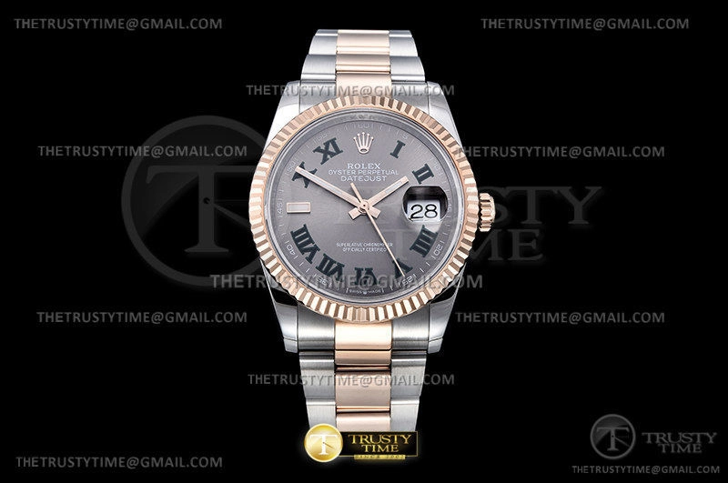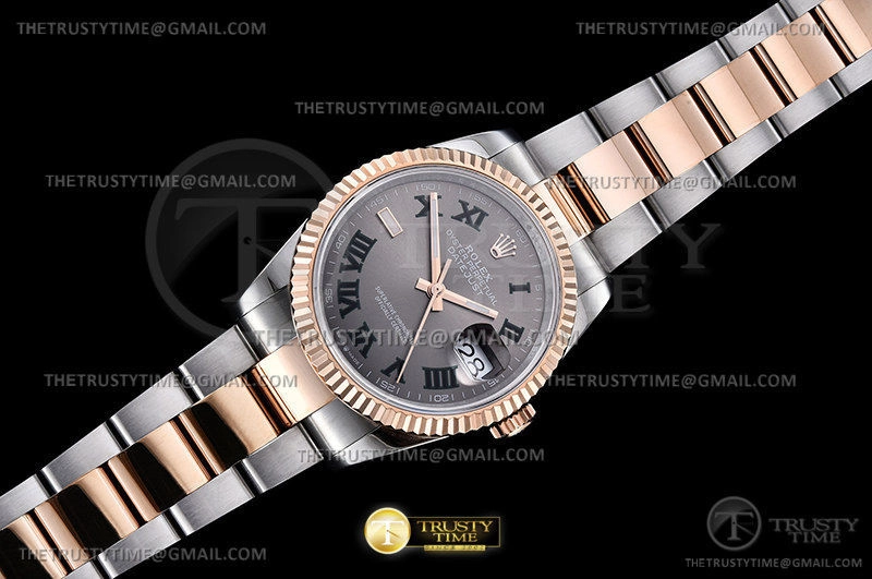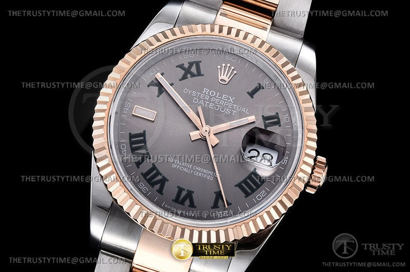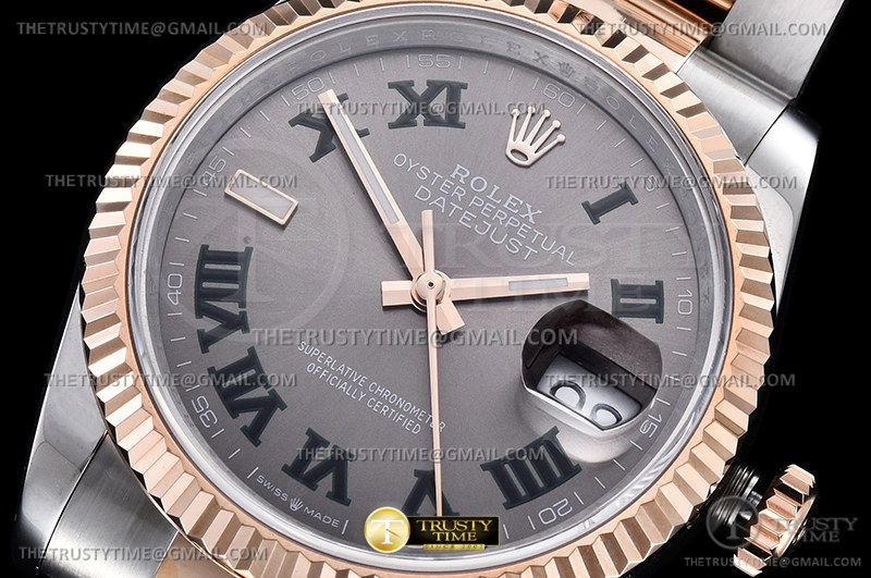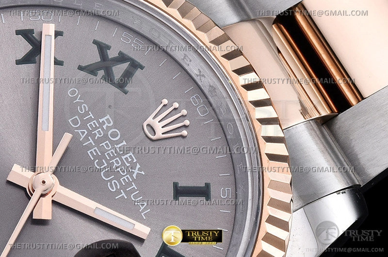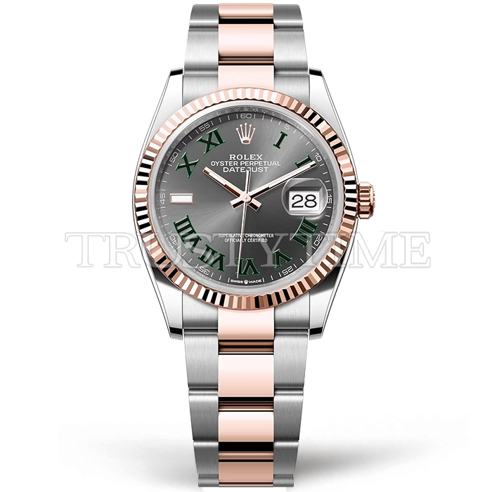Часы Rolex из коллекции DateJust. Классические женские часы Rolex DateJust 36mm 126231-0030 премиального качества (Артикул магазина: RX-2118) оснащены надежным автоматическим механизмом с автоподзаводом (работает от амплитуды движения руки) калибра 3235, в котором реализованы следующие функции: часовая, минутная и секундная стрелки, а так же дата. Круглый корпус часов комбинированного сталь с розового золота цвета, имеющий размер 36 мм и высоту 12 мм превосходно дополнит образ и украсит запястье своего обладателя. Для изготовления часов Rolex DateJust 36mm 126231-0030 предлагаемых в нашем интернет-магазине, применяются нержавеющая сталь 316L высокого качества (Швейцарский стандарт), а так же сапфировое стекло высокой прочности, благодаря чему обеспечивается максимальная защита от сколов и механических повреждений. Отличительной чертой данной модели является серый циферблат, часовые индексы которого обеспечивают римские цифры. Завершает образ браслет из нержавеющей стали комбинированного сталь с розовым золотом цвета с фирменной раскладывающейся застежкой Rolex. Водонепроницаемость данной модели составляет 30М (WR30) – допускается минимальное воздействие с водой.