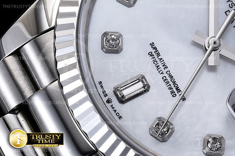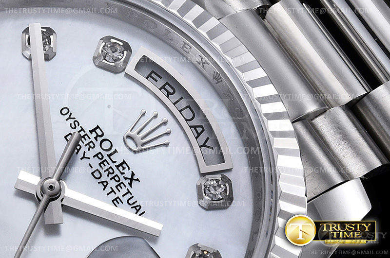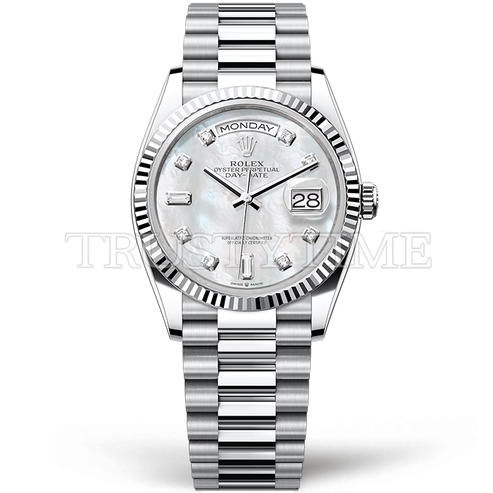 Часы Rolex из коллекции Day-Date. Классические женские часы Rolex Day-Date 36mm 128236-0002 премиального качества (Артикул магазина: RX-0891) оснащены надежным автоматическим механизмом с автоподзаводом (работает от амплитуды движения руки) калибра 3255, в котором реализованы следующие функции: часовая, минутная и секундная стрелки, а так же дата, день недели. Круглый корпус часов стального цвета, имеющий размер 36 мм и высоту 12 мм превосходно дополнит образ и украсит запястье своего обладателя. Для изготовления часов Rolex Day-Date 36mm 128236-0002 предлагаемых в нашем интернет-магазине, применяются нержавеющая сталь 316F высокого качества (Швейцарский стандарт), а так же сапфировое стекло высокой прочности, благодаря чему обеспечивается максимальная защита от сколов и механических повреждений. Отличительной чертой данной модели является перламутровый циферблат, часовые индексы которого обеспечивают камни. Завершает образ браслет из нержавеющей стали стального цвета с фирменной раскладывающейся застежкой Rolex. Водонепроницаемость данной модели составляет 30М (WR30) – допускается минимальное воздействие с водой.