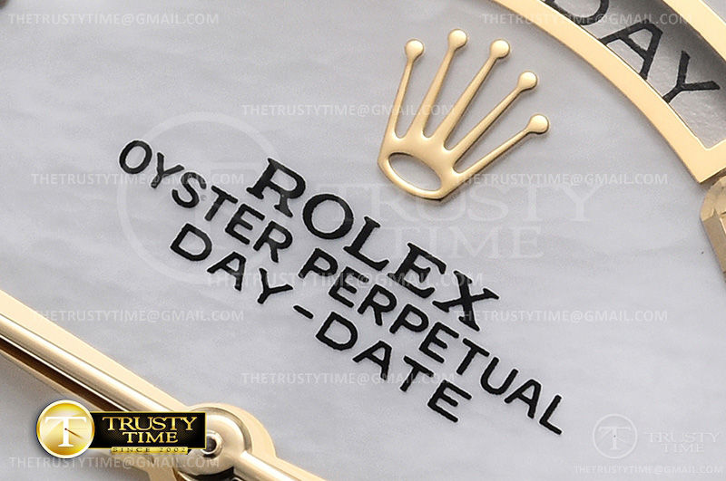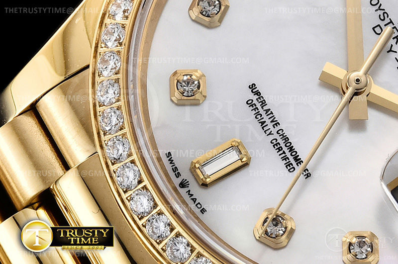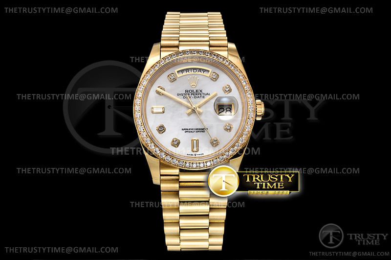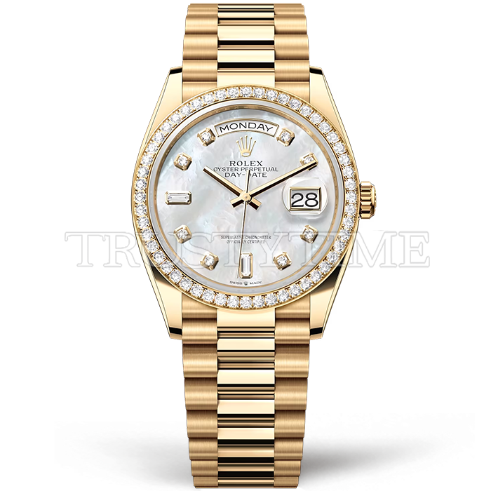 Часы Rolex из коллекции Day-Date. Классические женские часы Rolex Day-Date 36mm 128348RBR-0017 премиального качества (Артикул магазина: RX-1615) оснащены надежным автоматическим механизмом с автоподзаводом (работает от амплитуды движения руки) калибра 3255, в котором реализованы следующие функции: часовая, минутная и секундная стрелки, а так же дата. Круглый корпус часов цветы желтой золота, имеющий размер 36 мм и высоту 12 мм превосходно дополнит образ и украсит запястье своего обладателя. Для изготовления часов Rolex Day-Date 36mm 128348RBR-0017 предлагаемых в нашем интернет-магазине, применяются нержавеющая сталь 316F высокого качества (Швейцарский стандарт), а так же сапфировое стекло высокой прочности, благодаря чему обеспечивается максимальная защита от сколов и механических повреждений. Отличительной чертой данной модели является перламутровый циферблат, часовые индексы которого обеспечивают камни. Завершает образ браслет из нержавеющей стали цвета желтого золота с фирменной раскладывающейся застежкой Rolex. Водонепроницаемость данной модели составляет 30М (WR30) – допускается минимальное воздействие с водой.