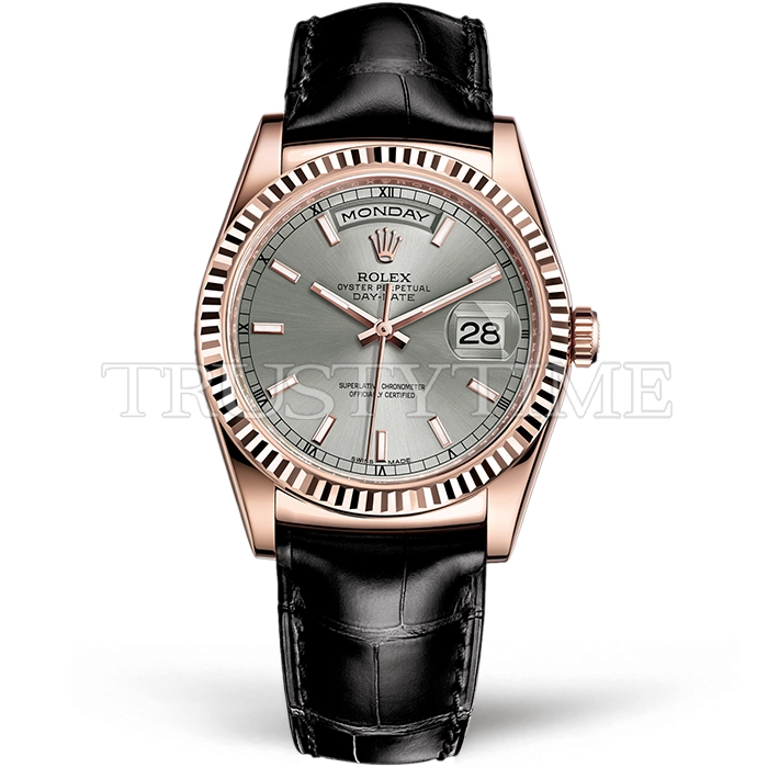 Часы Rolex из коллекции Day-Date. Классические женские часы Rolex Day-Date 36mm 118135-0005 премиального качества (Артикул магазина: RX-0396) оснащены надежным автоматическим механизмом с автоподзаводом (работает от амплитуды движения руки) калибра 3155, в котором реализованы следующие функции: часовая, минутная и секундная стрелки, а так же дата, день недели. Круглый корпус часов розового цвета, имеющий размер 36 мм и высоту 11 мм превосходно дополнит образ и украсит запястье своего обладателя. Для изготовления часов Rolex Day-Date 36mm 118135-0005 предлагаемых в нашем интернет-магазине, применяются нержавеющая сталь 316L высокого качества (Швейцарский стандарт), а так же сапфировое стекло высокой прочности, благодаря чему обеспечивается максимальная защита от сколов и механических повреждений. Отличительной чертой данной модели является серый циферблат, часовые индексы которого обеспечивают часовые метки. Завершает образ кожаный ремешок черного цвета с фирменной раскладывающейся застежкой Rolex. Водонепроницаемость данной модели составляет 30М (WR30) – допускается минимальное воздействие с водой.
