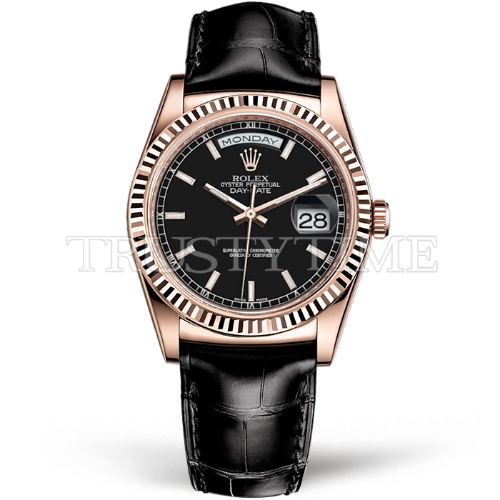 Часы Rolex из коллекции Day-Date. Классические женские часы Rolex Day-Date 36mm 118135-0063 премиального качества (Артикул магазина: RX-0397) оснащены надежным автоматическим механизмом с автоподзаводом (работает от амплитуды движения руки) калибра 3155, в котором реализованы следующие функции: часовая, минутная и секундная стрелки, а так же дата, день недели. Круглый корпус часов розового цвета, имеющий размер 36 мм и высоту 11 мм превосходно дополнит образ и украсит запястье своего обладателя. Для изготовления часов Rolex Day-Date 36mm 118135-0063 предлагаемых в нашем интернет-магазине, применяются нержавеющая сталь 316L высокого качества (Швейцарский стандарт), а так же сапфировое стекло высокой прочности, благодаря чему обеспечивается максимальная защита от сколов и механических повреждений. Отличительной чертой данной модели является черный циферблат, часовые индексы которого обеспечивают часовые метки. Завершает образ кожаный ремешок черного цвета с фирменной раскладывающейся застежкой Rolex. Водонепроницаемость данной модели составляет 30М (WR30) – допускается минимальное воздействие с водой.