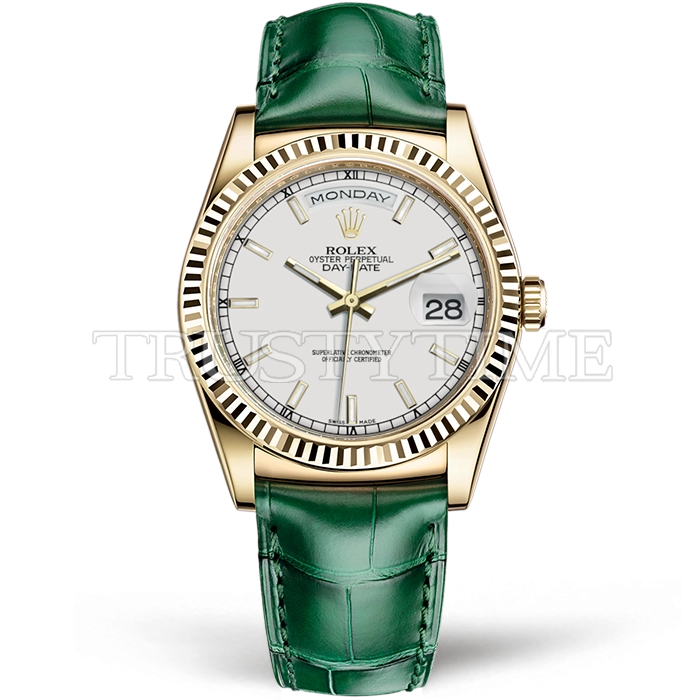 Часы Rolex из коллекции Day-Date. Классические женские часы Rolex Day-Date 36mm 118138-0123 премиального качества (Артикул магазина: RX-0399) оснащены надежным автоматическим механизмом с автоподзаводом (работает от амплитуды движения руки) калибра 3155, в котором реализованы следующие функции: часовая, минутная и секундная стрелки, а так же дата, день недели. Круглый корпус часов цветы желтой золота, имеющий размер 36 мм и высоту 11 мм превосходно дополнит образ и украсит запястье своего обладателя. Для изготовления часов Rolex Day-Date 36mm 118138-0123 предлагаемых в нашем интернет-магазине, применяются нержавеющая сталь 316L высокого качества (Швейцарский стандарт), а так же сапфировое стекло высокой прочности, благодаря чему обеспечивается максимальная защита от сколов и механических повреждений. Отличительной чертой данной модели является белый циферблат, часовые индексы которого обеспечивают часовые метки. Завершает образ кожаный ремешок зеленого цвета с фирменной раскладывающейся застежкой Rolex. Водонепроницаемость данной модели составляет 30М (WR30) – допускается минимальное воздействие с водой.