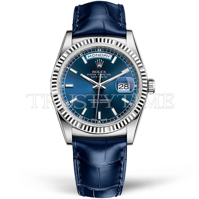 Часы Rolex из коллекции Day-Date. Классические женские часы Rolex Day-Date 36mm 118139-0004 премиального качества (Артикул магазина: RX-0401) оснащены надежным автоматическим механизмом с автоподзаводом (работает от амплитуды движения руки) калибра 3155, в котором реализованы следующие функции: часовая, минутная и секундная стрелки, а так же дата, день недели. Круглый корпус часов стального цвета, имеющий размер 36 мм и высоту 11 мм превосходно дополнит образ и украсит запястье своего обладателя. Для изготовления часов Rolex Day-Date 36mm 118139-0004 предлагаемых в нашем интернет-магазине, применяются нержавеющая сталь 316L высокого качества (Швейцарский стандарт), а так же сапфировое стекло высокой прочности, благодаря чему обеспечивается максимальная защита от сколов и механических повреждений. Отличительной чертой данной модели является синий циферблат, часовые индексы которого обеспечивают часовые метки. Завершает образ кожаный ремешок синего цвета с фирменной раскладывающейся застежкой Rolex. Водонепроницаемость данной модели составляет 30М (WR30) – допускается минимальное воздействие с водой.