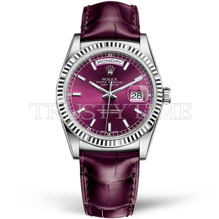 Часы Rolex из коллекции Day-Date. Классические женские часы Rolex Day-Date 36mm 118139-0007 премиального качества (Артикул магазина: RX-0403) оснащены надежным автоматическим механизмом с автоподзаводом (работает от амплитуды движения руки) калибра 3155, в котором реализованы следующие функции: часовая, минутная и секундная стрелки, а так же дата, день недели. Круглый корпус часов стального цвета, имеющий размер 36 мм и высоту 11 мм превосходно дополнит образ и украсит запястье своего обладателя. Для изготовления часов Rolex Day-Date 36mm 118139-0007 предлагаемых в нашем интернет-магазине, применяются нержавеющая сталь 316L высокого качества (Швейцарский стандарт), а так же сапфировое стекло высокой прочности, благодаря чему обеспечивается максимальная защита от сколов и механических повреждений. Отличительной чертой данной модели является бордовый циферблат, часовые индексы которого обеспечивают часовые метки. Завершает образ кожаный ремешок бордового цвета с фирменной раскладывающейся застежкой Rolex. Водонепроницаемость данной модели составляет 30М (WR30) – допускается минимальное воздействие с водой.