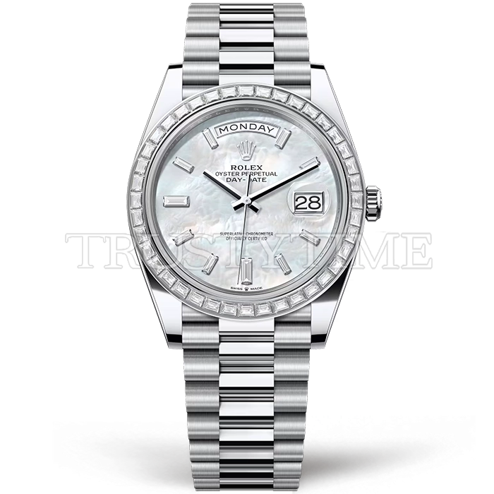 Часы Rolex из коллекции Day-Date. Классические мужские часы Rolex Day-Date 40mm 228396TBR-0043 премиального качества (Артикул магазина: RX-3596) оснащены надежным автоматическим механизмом с автоподзаводом (работает от амплитуды движения руки) калибра 3255, в котором реализованы следующие функции: часовая, минутная и секундная стрелки, а так же дата, день недели. Круглый корпус часов стального цвета, имеющий размер 40 мм и высоту 12 мм превосходно дополнит образ и украсит запястье своего обладателя. Для изготовления часов Rolex Day-Date 40mm 228396TBR-0043 предлагаемых в нашем интернет-магазине, применяются нержавеющая сталь 904 высокого качества (Швейцарский стандарт), а так же сапфировое стекло высокой прочности, благодаря чему обеспечивается максимальная защита от сколов и механических повреждений. Отличительной чертой данной модели является перламутровый циферблат, часовые индексы которого обеспечивают камни. Завершает образ браслет из нержавеющей стали стального цвета с фирменной раскладывающейся застежкой Rolex. Водонепроницаемость данной модели составляет 30М (WR30) – допускается минимальное воздействие с водой.