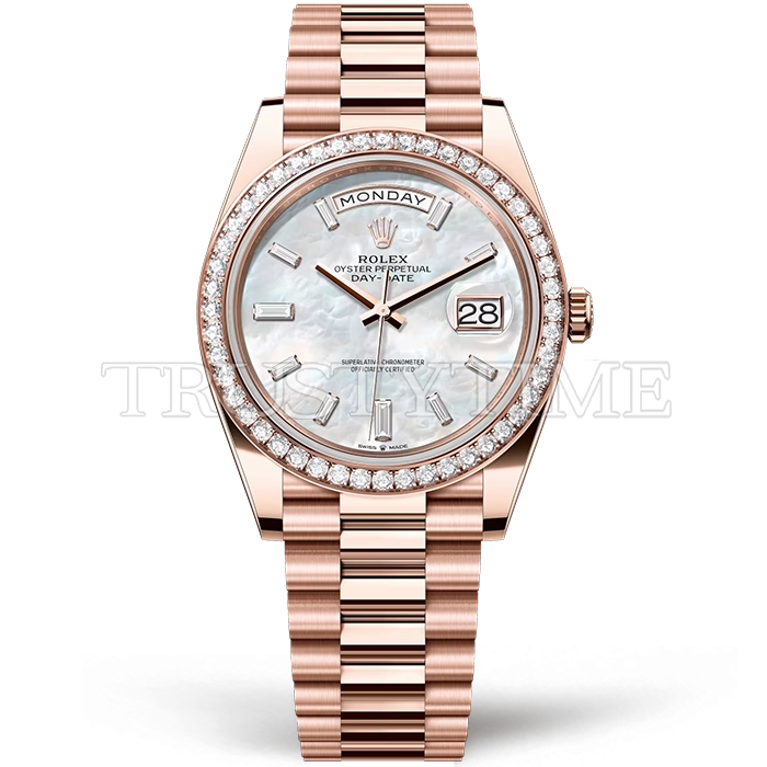 Часы Rolex из коллекции Day-Date. Классические мужские часы Rolex Day-Date 40mm 228345RBR-0026 премиального качества (Артикул магазина: RX-3603) оснащены надежным автоматическим механизмом с автоподзаводом (работает от амплитуды движения руки) калибра 3255, в котором реализованы следующие функции: часовая, минутная и секундная стрелки, а так же дата, день недели. Круглый корпус часов стального цвета, имеющий размер 40 мм и высоту 12 мм превосходно дополнит образ и украсит запястье своего обладателя. Для изготовления часов Rolex Day-Date 40mm 228345RBR-0026 предлагаемых в нашем интернет-магазине, применяются нержавеющая сталь 904 высокого качества (Швейцарский стандарт), а так же сапфировое стекло высокой прочности, благодаря чему обеспечивается максимальная защита от сколов и механических повреждений. Отличительной чертой данной модели является перламутровый циферблат, часовые индексы которого обеспечивают камни. Завершает образ браслет из нержавеющей стали цвета розового золота с фирменной раскладывающейся застежкой Rolex. Водонепроницаемость данной модели составляет 30М (WR30) – допускается минимальное воздействие с водой.
