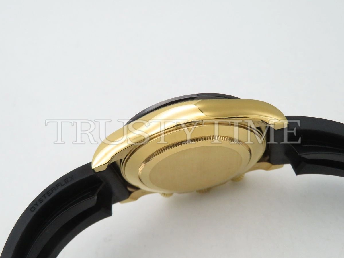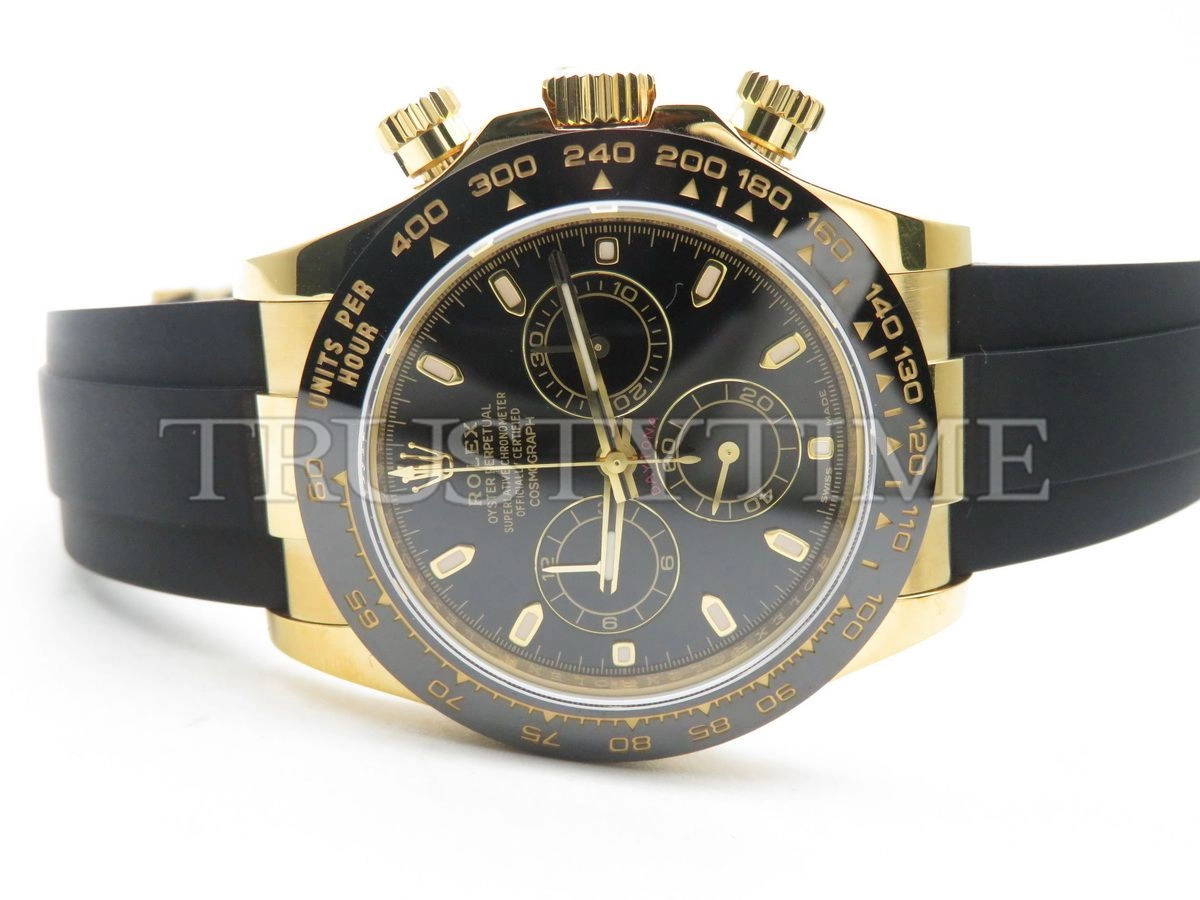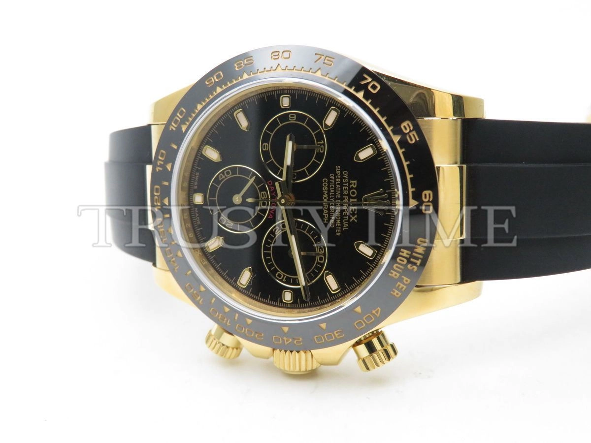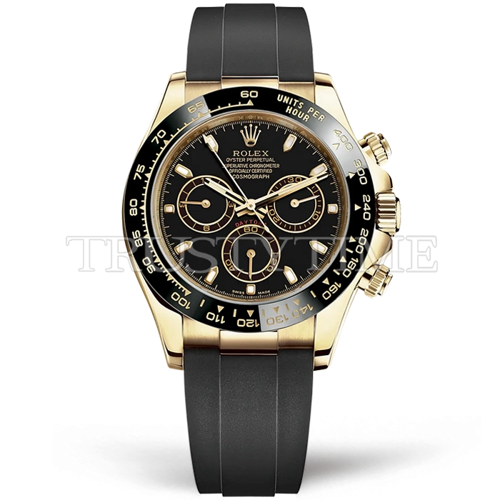 Часы Rolex из коллекции Daytona. Спортивные мужские часы Rolex Cosmograph Daytona 116518LN-0043 премиального качества (Артикул магазина: RX-1057) оснащены надежным автоматическим механизмом с автоподзаводом (работает от амплитуды движения руки) калибра 4130, в котором реализованы следующие функции: часовая, минутная и секундная стрелки, а так же хронограф. Круглый корпус часов цветы желтой золота, имеющий размер 40 мм и высоту 12.5 мм превосходно дополнит образ и украсит запястье своего обладателя. Для изготовления часов Rolex Cosmograph Daytona 116518LN-0043 предлагаемых в нашем интернет-магазине, применяются нержавеющая сталь 904L высокого качества (Швейцарский стандарт), а так же сапфировое стекло высокой прочности, благодаря чему обеспечивается максимальная защита от сколов и механических повреждений. Отличительной чертой данной модели является черный циферблат, часовые индексы которого обеспечивают часовые метки. Завершает образ каучуковый ремешок черного цвета с фирменной раскладывающейся застежкой Rolex. Водонепроницаемость данной модели составляет 100М (WR100) – в таких часах можно плавать и нырять без акваланга в морской и пресной воде, а также заниматься водными видами спорта.