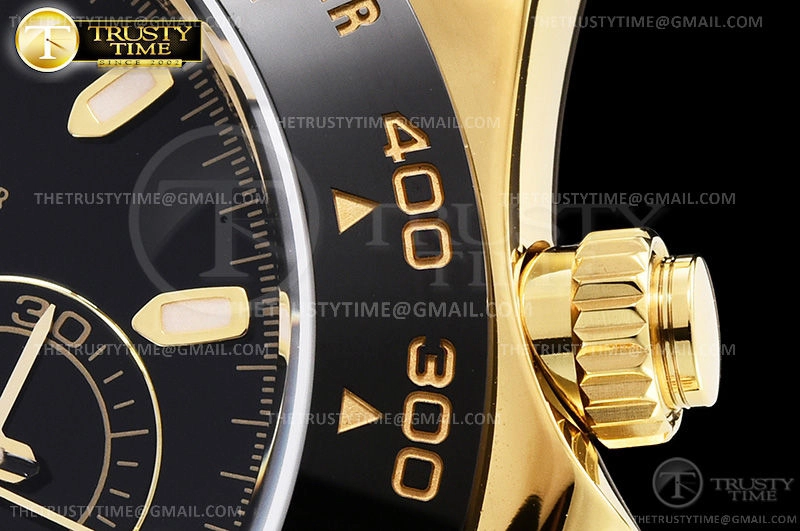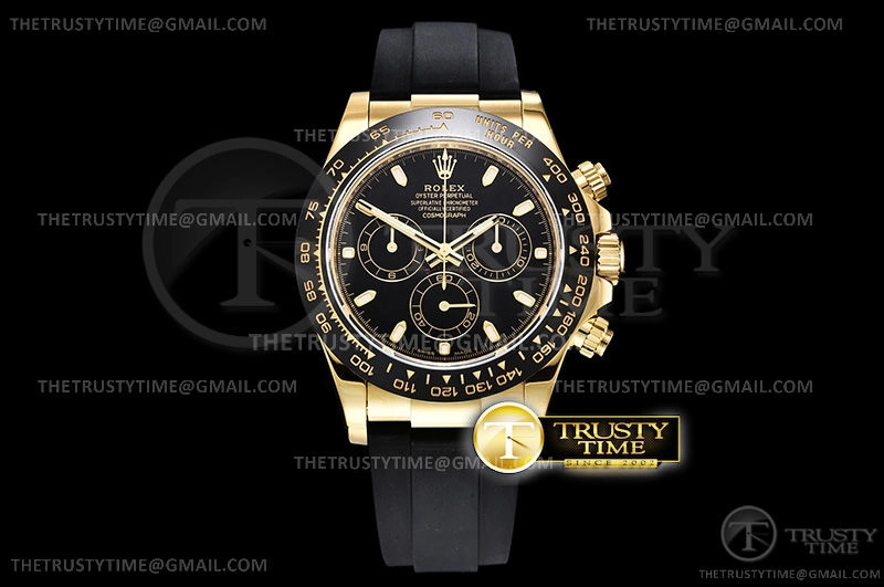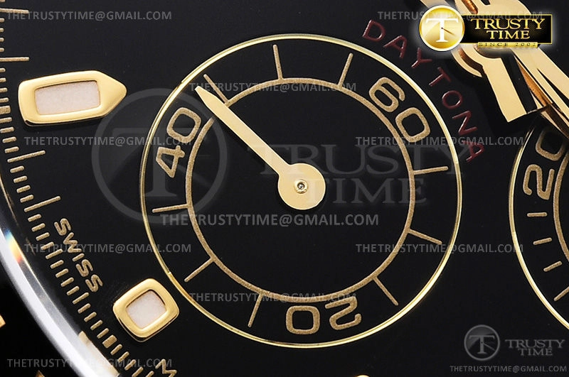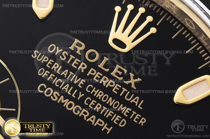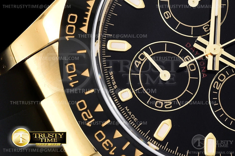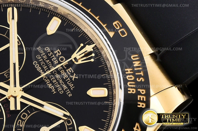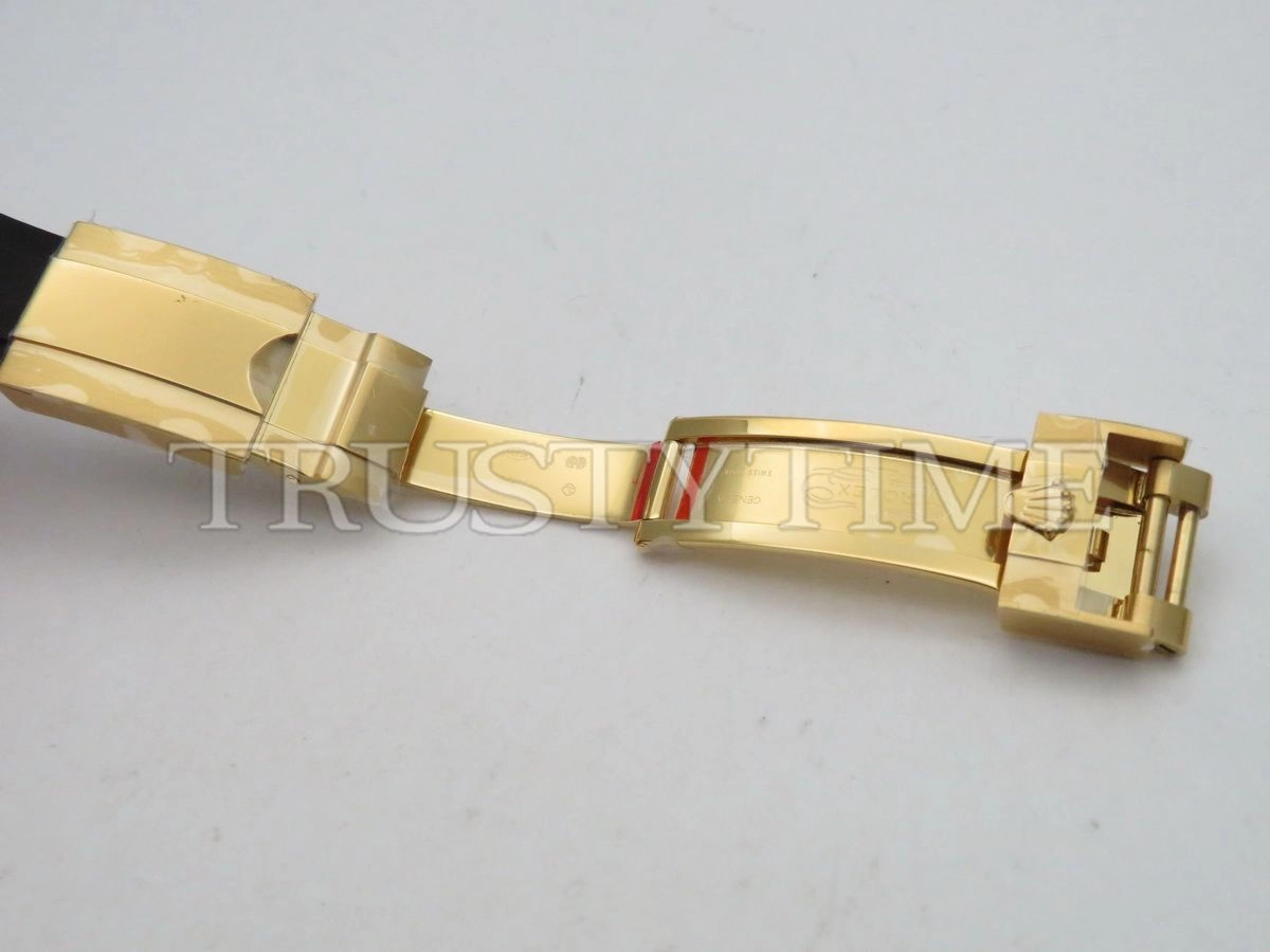 Часы Rolex из коллекции Daytona. Спортивные мужские часы Rolex Cosmograph Daytona 116518LN-0043 премиального качества (Артикул магазина: RX-1057) оснащены надежным автоматическим механизмом с автоподзаводом (работает от амплитуды движения руки) калибра 4130, в котором реализованы следующие функции: часовая, минутная и секундная стрелки, а так же хронограф. Круглый корпус часов цветы желтой золота, имеющий размер 40 мм и высоту 12.5 мм превосходно дополнит образ и украсит запястье своего обладателя. Для изготовления часов Rolex Cosmograph Daytona 116518LN-0043 предлагаемых в нашем интернет-магазине, применяются нержавеющая сталь 904L высокого качества (Швейцарский стандарт), а так же сапфировое стекло высокой прочности, благодаря чему обеспечивается максимальная защита от сколов и механических повреждений. Отличительной чертой данной модели является черный циферблат, часовые индексы которого обеспечивают часовые метки. Завершает образ каучуковый ремешок черного цвета с фирменной раскладывающейся застежкой Rolex. Водонепроницаемость данной модели составляет 100М (WR100) – в таких часах можно плавать и нырять без акваланга в морской и пресной воде, а также заниматься водными видами спорта.