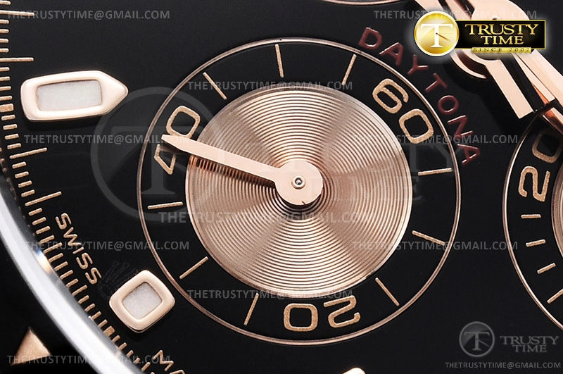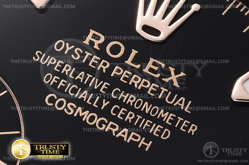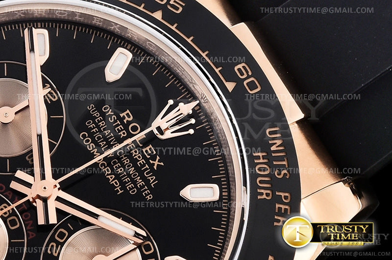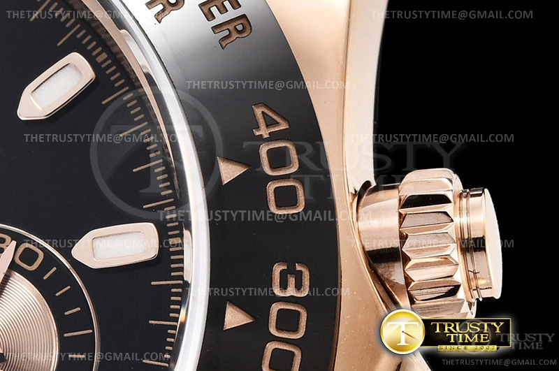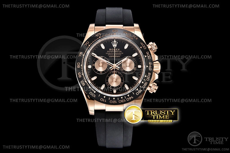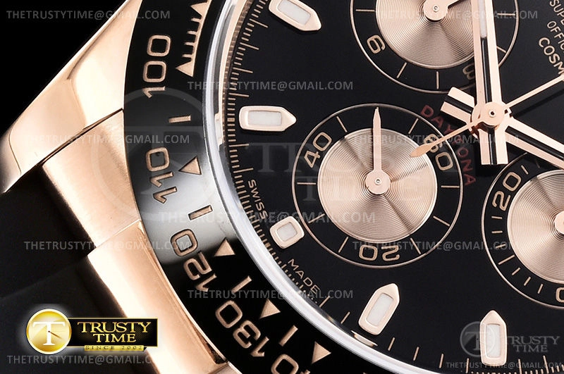 Часы Rolex из коллекции Daytona. Спортивные мужские часы Rolex Cosmograph Daytona 116515LN-0017 премиального качества (Артикул магазина: RX-1054) оснащены надежным автоматическим механизмом с автоподзаводом (работает от амплитуды движения руки) калибра 4130, в котором реализованы следующие функции: часовая, минутная и секундная стрелки, а так же хронограф. Круглый корпус часов розового цвета, имеющий размер 40 мм и высоту 12.5 мм превосходно дополнит образ и украсит запястье своего обладателя. Для изготовления часов Rolex Cosmograph Daytona 116515LN-0017 предлагаемых в нашем интернет-магазине, применяются нержавеющая сталь 904L высокого качества (Швейцарский стандарт), а так же сапфировое стекло высокой прочности, благодаря чему обеспечивается максимальная защита от сколов и механических повреждений. Отличительной чертой данной модели является черный циферблат, часовые индексы которого обеспечивают часовые метки. Завершает образ каучуковый ремешок черного цвета с фирменной раскладывающейся застежкой Rolex. Водонепроницаемость данной модели составляет 100М (WR100) – в таких часах можно плавать и нырять без акваланга в морской и пресной воде, а также заниматься водными видами спорта.