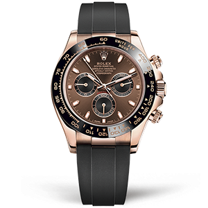 Часы Rolex из коллекции Daytona. Спортивные мужские часы Rolex Cosmograph Daytona 116515LN-0041 премиального качества (Артикул магазина: RX-1309) оснащены надежным автоматическим механизмом с автоподзаводом (работает от амплитуды движения руки) калибра 4130, в котором реализованы следующие функции: часовая, минутная и секундная стрелки, а так же хронограф, дата. Круглый корпус часов розового цвета, имеющий размер 40 мм и высоту 12.5 мм превосходно дополнит образ и украсит запястье своего обладателя. Для изготовления часов Rolex Cosmograph Daytona 116515LN-0041 предлагаемых в нашем интернет-магазине, применяются нержавеющая сталь 904L высокого качества (Швейцарский стандарт), а так же сапфировое стекло высокой прочности, благодаря чему обеспечивается максимальная защита от сколов и механических повреждений. Отличительной чертой данной модели является коричневый циферблат, часовые индексы которого обеспечивают часовые метки. Завершает образ каучуковый ремешок черного цвета с фирменной раскладывающейся застежкой Rolex. Водонепроницаемость данной модели составляет 100М (WR100) – в таких часах можно плавать и нырять без акваланга в морской и пресной воде, а также заниматься водными видами спорта.