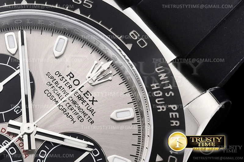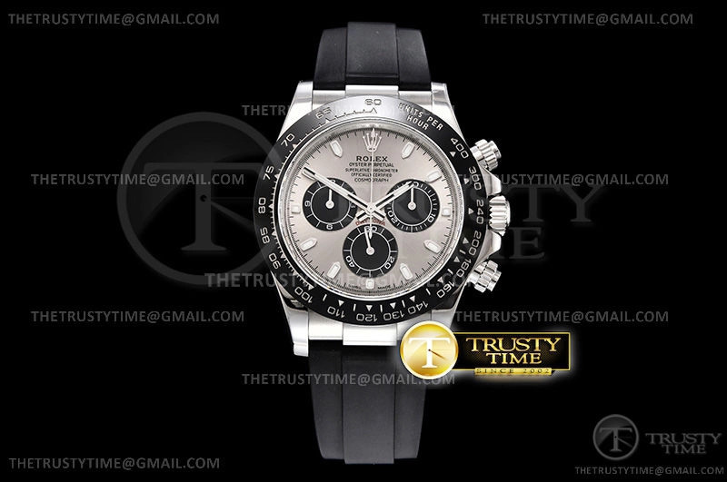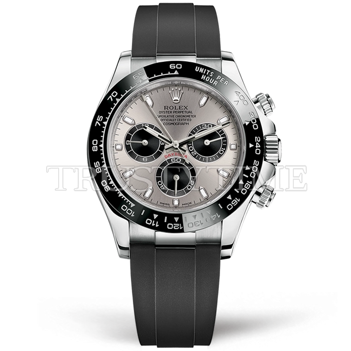 Часы Rolex из коллекции Daytona. Спортивные мужские часы Rolex Cosmograph Daytona 116519LN-0027 премиального качества (Артикул магазина: RX-1620) оснащены надежным автоматическим механизмом с автоподзаводом (работает от амплитуды движения руки) калибра 4130, в котором реализованы следующие функции: часовая, минутная и секундная стрелки, а так же хронограф. Круглый корпус часов стального цвета, имеющий размер 40 мм и высоту 12.5 мм превосходно дополнит образ и украсит запястье своего обладателя. Для изготовления часов Rolex Cosmograph Daytona 116519LN-0027 предлагаемых в нашем интернет-магазине, применяются нержавеющая сталь 904L высокого качества (Швейцарский стандарт), а так же сапфировое стекло высокой прочности, благодаря чему обеспечивается максимальная защита от сколов и механических повреждений. Отличительной чертой данной модели является серебристый циферблат, часовые индексы которого обеспечивают часовые метки. Завершает образ каучуковый ремешок черного цвета с фирменной раскладывающейся застежкой Rolex. Водонепроницаемость данной модели составляет 100М (WR100) – в таких часах можно плавать и нырять без акваланга в морской и пресной воде, а также заниматься водными видами спорта.