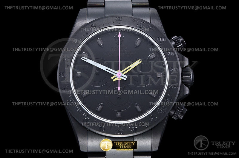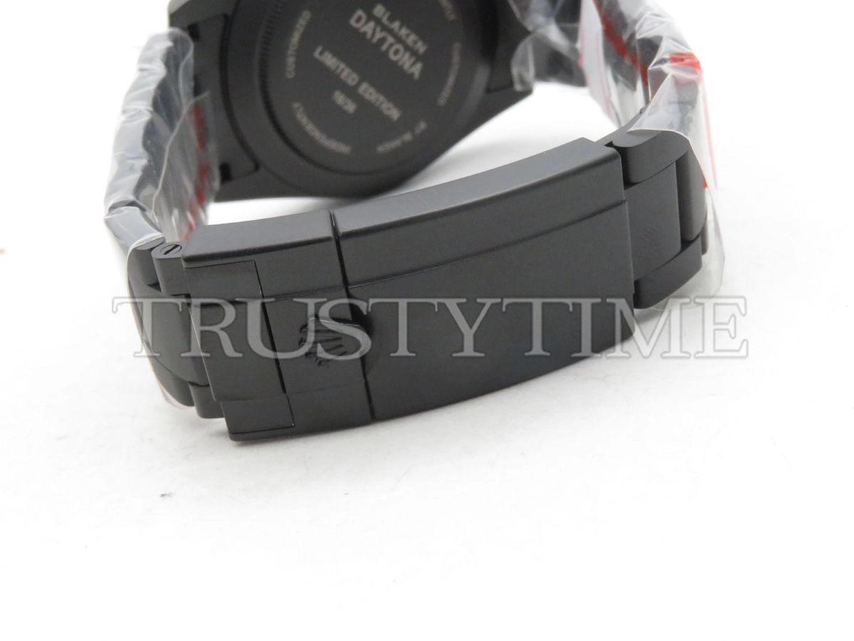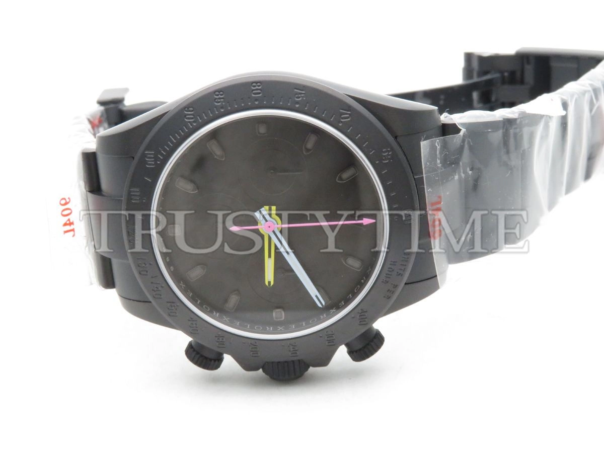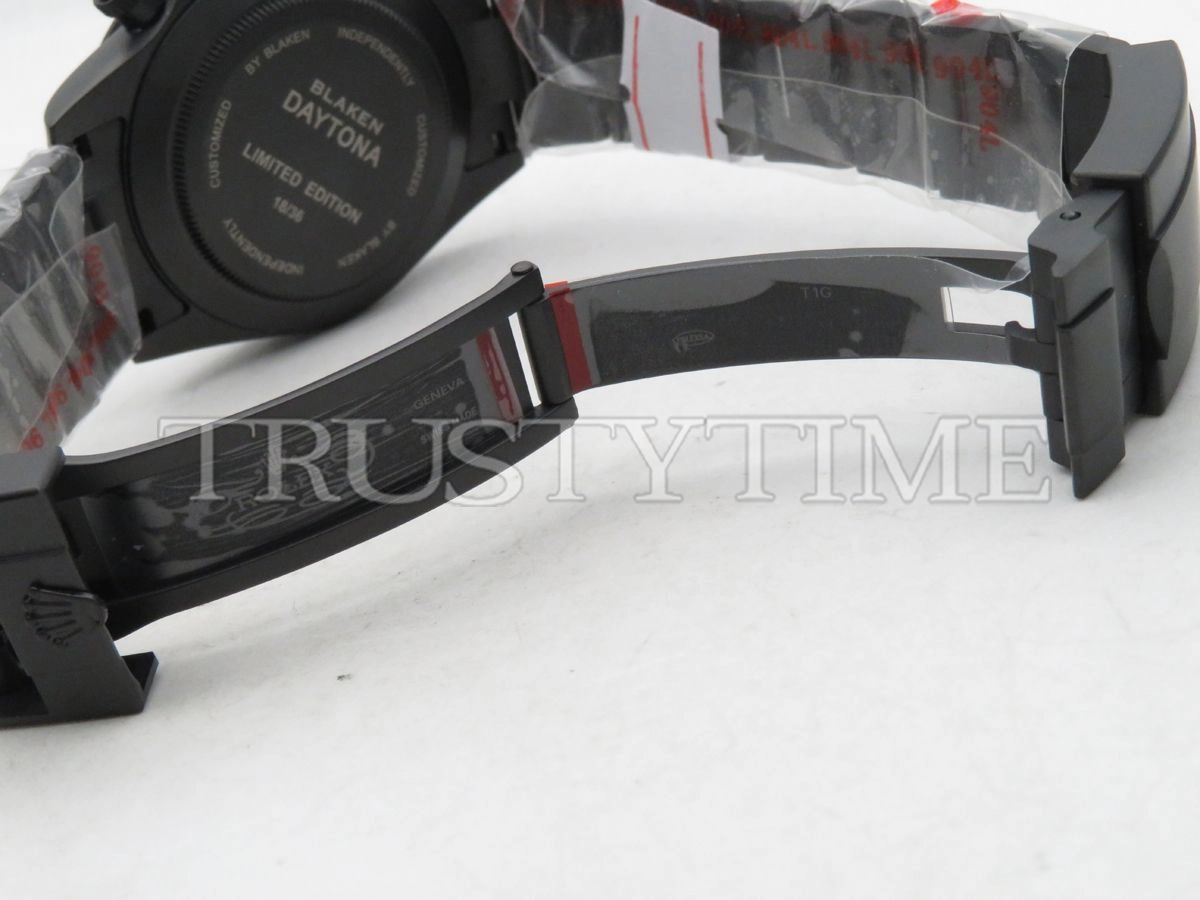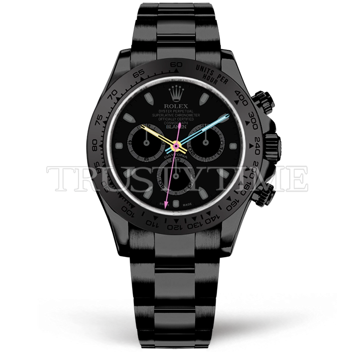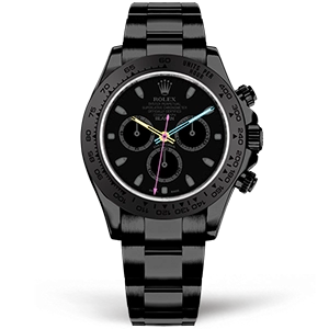 Часы Rolex из коллекции Daytona Blaken. Спортивные мужские часы Rolex Blaken Daytona премиального качества (Артикул магазина: RX-1891) оснащены надежным автоматическим механизмом с автоподзаводом (работает от амплитуды движения руки) калибра 4130, в котором реализованы следующие функции: часовая, минутная и секундная стрелки, а так же хронограф. Круглый корпус часов черного цвета, имеющий размер 40 мм и высоту 12.5 мм превосходно дополнит образ и украсит запястье своего обладателя. Для изготовления часов Rolex Blaken Daytona предлагаемых в нашем интернет-магазине, применяются нержавеющая сталь 904L высокого качества (Швейцарский стандарт), а так же сапфировое стекло высокой прочности, благодаря чему обеспечивается максимальная защита от сколов и механических повреждений. Отличительной чертой данной модели является черный циферблат, часовые индексы которого обеспечивают часовые метки. Завершает образ браслет из нержавеющей стали черного цвета с фирменной раскладывающейся застежкой Rolex. Водонепроницаемость данной модели составляет 30М (WR30) – допускается минимальное воздействие с водой.