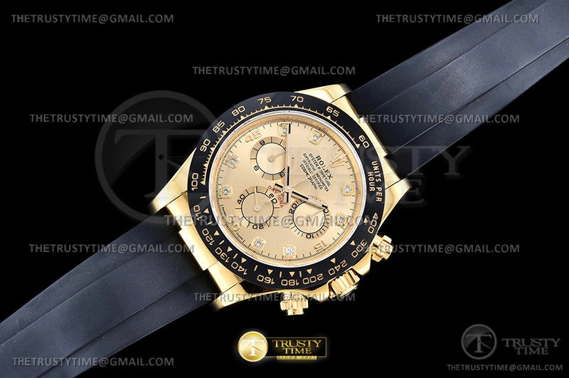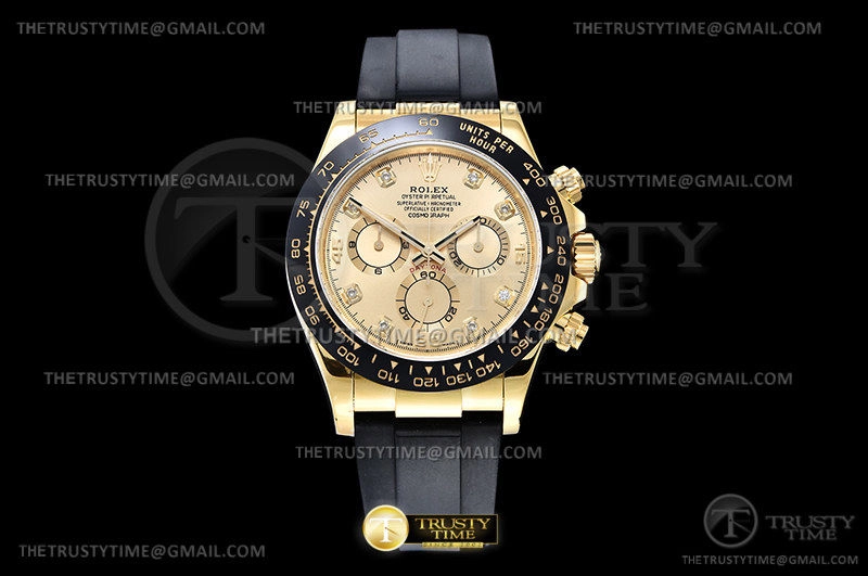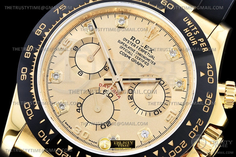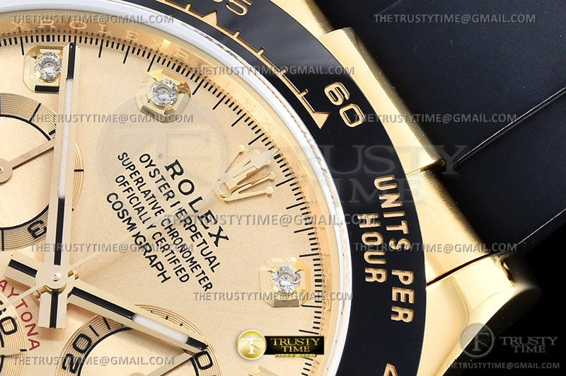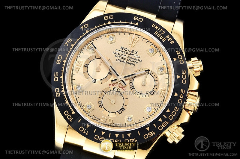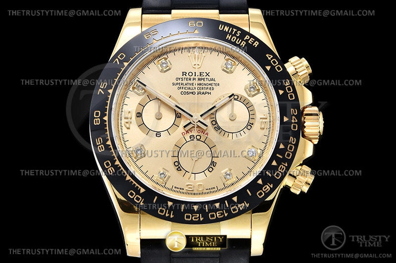 Часы Rolex из коллекции Daytona. Спортивные мужские часы Rolex Cosmograph Daytona 116518LN-0044 премиального качества (Артикул магазина: RX-1916) оснащены надежным автоматическим механизмом с автоподзаводом (работает от амплитуды движения руки) калибра 4130, в котором реализованы следующие функции: часовая, минутная и секундная стрелки, а так же хронограф. Круглый корпус часов цветы желтой золота, имеющий размер 40 мм и высоту 12.5 мм превосходно дополнит образ и украсит запястье своего обладателя. Для изготовления часов Rolex Cosmograph Daytona 116518LN-0044 предлагаемых в нашем интернет-магазине, применяются нержавеющая сталь 904L высокого качества (Швейцарский стандарт), а так же сапфировое стекло высокой прочности, благодаря чему обеспечивается максимальная защита от сколов и механических повреждений. Отличительной чертой данной модели является золотой циферблат, часовые индексы которого обеспечивают камни. Завершает образ каучуковый ремешок черного цвета с фирменной раскладывающейся застежкой Rolex. Водонепроницаемость данной модели составляет 100М (WR100) – в таких часах можно плавать и нырять без акваланга в морской и пресной воде, а также заниматься водными видами спорта.
