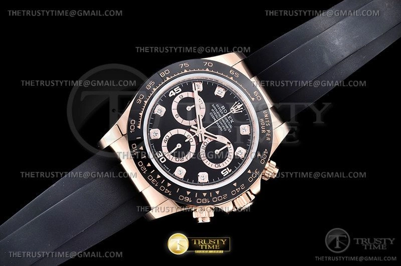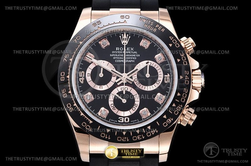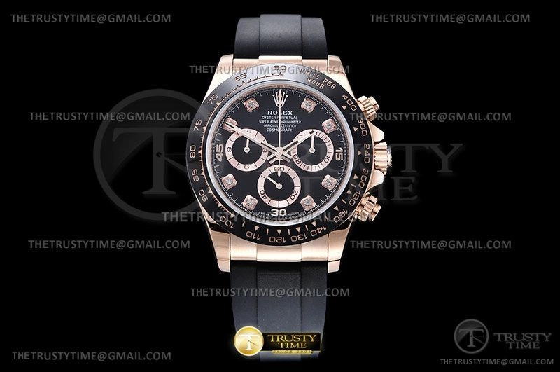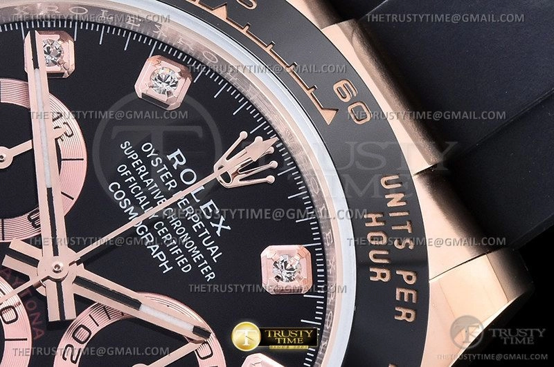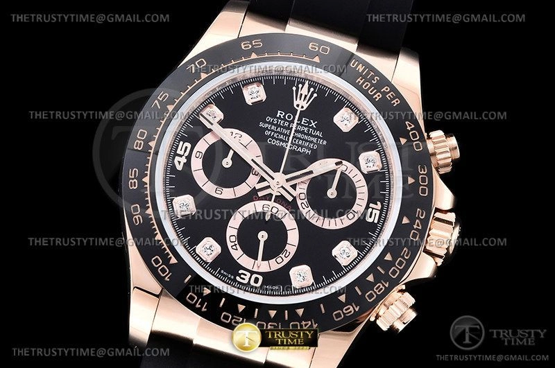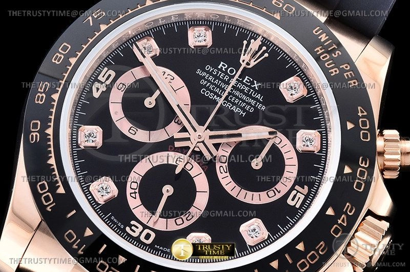 Часы Rolex из коллекции Daytona. Спортивные мужские часы Rolex Cosmograph Daytona 116515LN-0057 премиального качества (Артикул магазина: RX-2260) оснащены надежным автоматическим механизмом с автоподзаводом (работает от амплитуды движения руки) калибра 4130, в котором реализованы следующие функции: часовая, минутная и секундная стрелки, а так же хронограф. Круглый корпус часов розового цвета, имеющий размер 40 мм и высоту 12.5 мм превосходно дополнит образ и украсит запястье своего обладателя. Для изготовления часов Rolex Cosmograph Daytona 116515LN-0057 предлагаемых в нашем интернет-магазине, применяются нержавеющая сталь 904L высокого качества (Швейцарский стандарт), а так же сапфировое стекло высокой прочности, благодаря чему обеспечивается максимальная защита от сколов и механических повреждений. Отличительной чертой данной модели является черный циферблат, часовые индексы которого обеспечивают камни. Завершает образ каучуковый ремешок черного цвета с фирменной раскладывающейся застежкой Rolex. Водонепроницаемость данной модели составляет 100М (WR100) – в таких часах можно плавать и нырять без акваланга в морской и пресной воде, а также заниматься водными видами спорта.